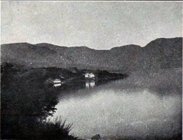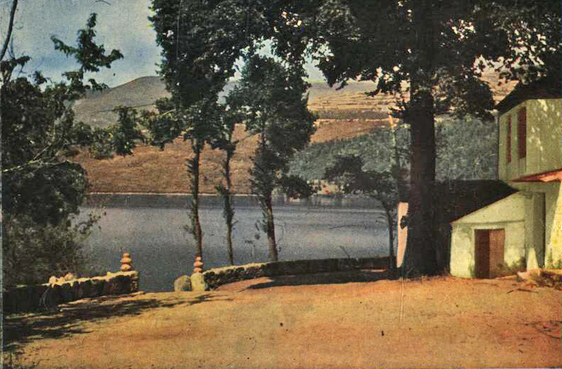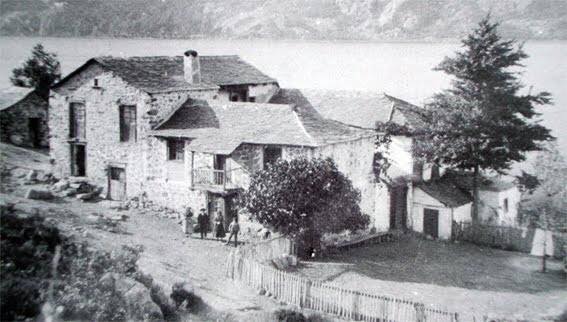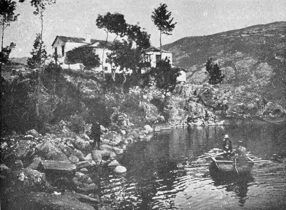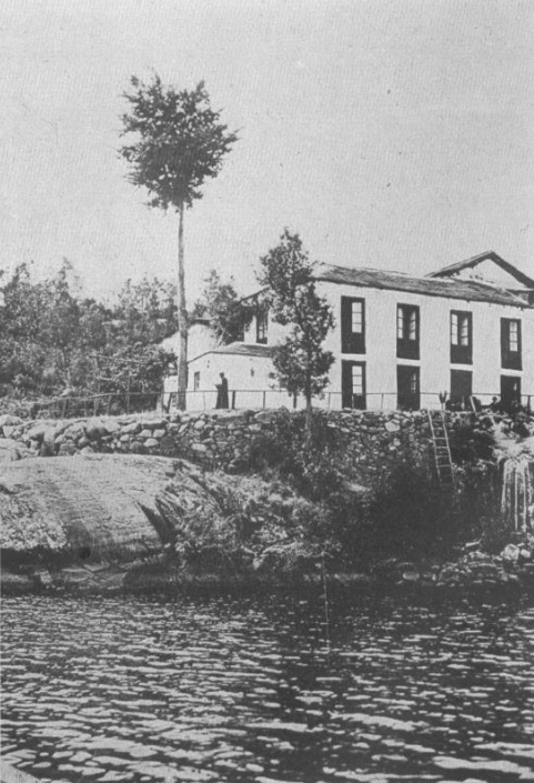 “… edificada á poco trecho de la orilla del lago, sobre una extensa roca que se hunde en él casi perpendicularmente, y en una ligera explanada que se ha aumentado con desmontes de no pequeño coste. Es de figura irregular, consta de dos pisos, bajo y principal, y entre ambos contiene habitaciones suficientes para alojar con comodidad hasta 40 bañistas. En su piso bajo se halla un espacioso comedor, que sirve también de salón de recreo (…) Contigua a la misma casa se encuentra una pequeña Capilla donde casi diariamente se celebra misa, de la que no carecen nunca los bañistas en los días festivos”