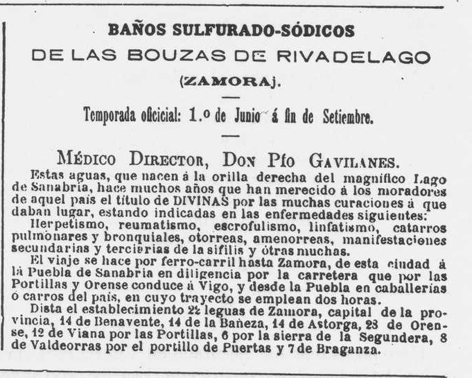 En los años siguientes la burguesía encontrará en estos lugares un lugar de descanso y esparcimiento, más allá de los fines estrictamente sanitarios. En el caso del balneario sanabrés se exaltan los paseos entre los frondosos bosques que circundan el balneario, el sonido de las aves (ruiseñores, oropéndolas, tórtolas, jilgueros, pardillos) “y otras aves cantoras que en tanta abundancia pululan por aquellas selvas”) y los paseos en el barco del dueño movido por cuatro remos y “si hay quien sepa manejarlo y sopla viento, armado de vela”.