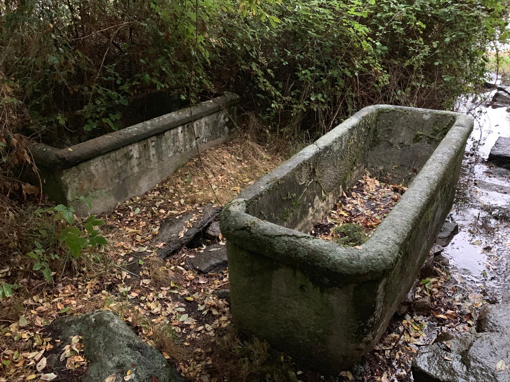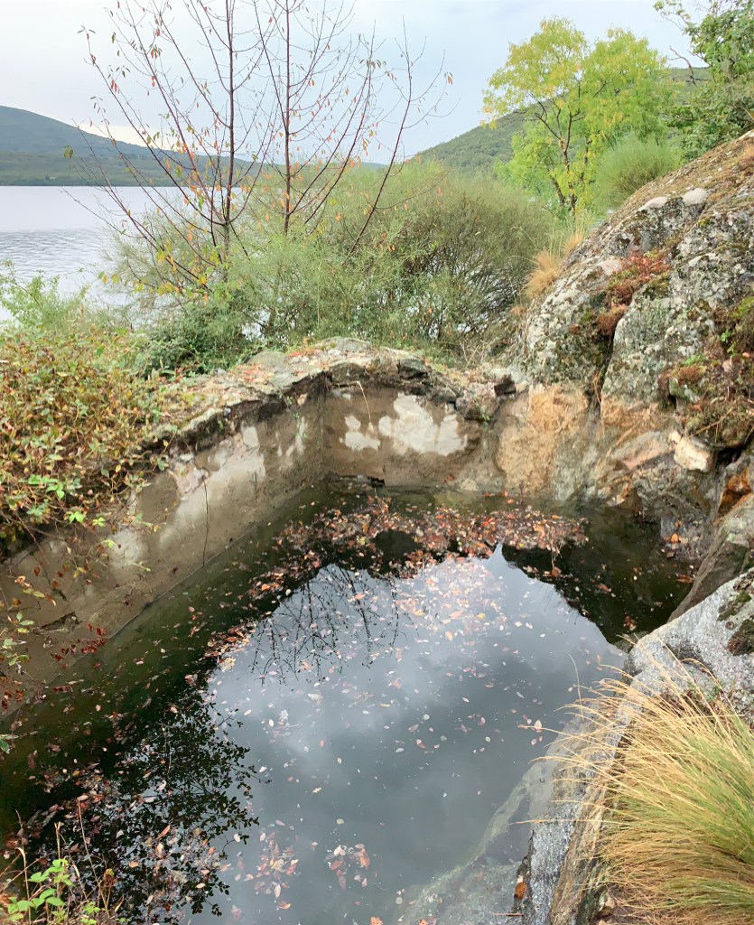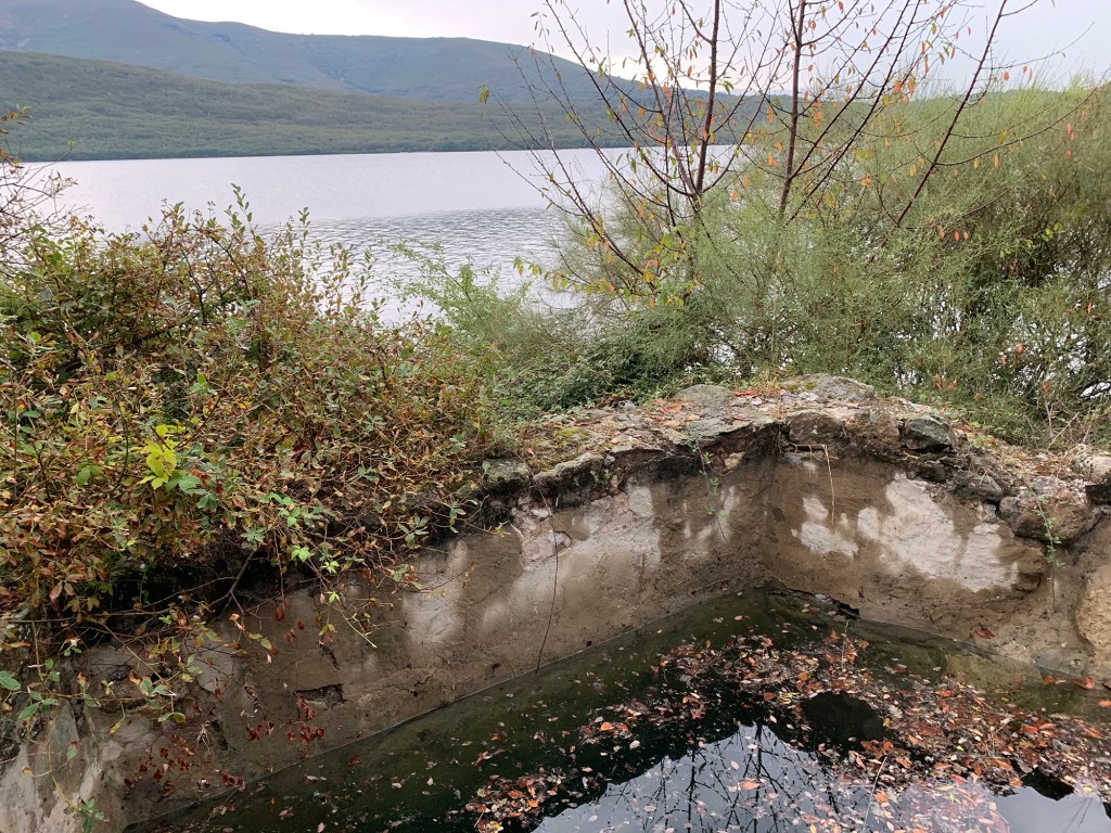 De las construcciones del balneario descritas en el extracto anterior solo queda en la actualidad el depósito de piedra unido a la gran roca de donde mana el agua, como se ve en las fotos actuales anteriores. La salida del agua desde este depósito suele estar taponada por las hojas que caen al mismo, si bien se libera fácilmente y el agua comienza a brotar por un pequeño orificio en la parte baja. El agua cae directamente al suelo, formando un pequeño reguero que se pierde en el lago. Junto a este depósito, al que se accede por un pequeño camino rodeado de zarzas, se encuentran bien visibles dos de las bañeras de piedra mencionadas en el texto, otras dos bañeras se esconden entre maleza y escombros.