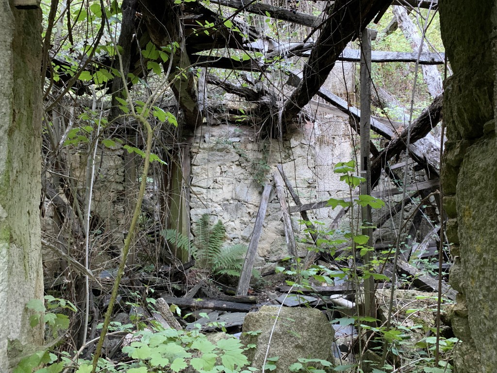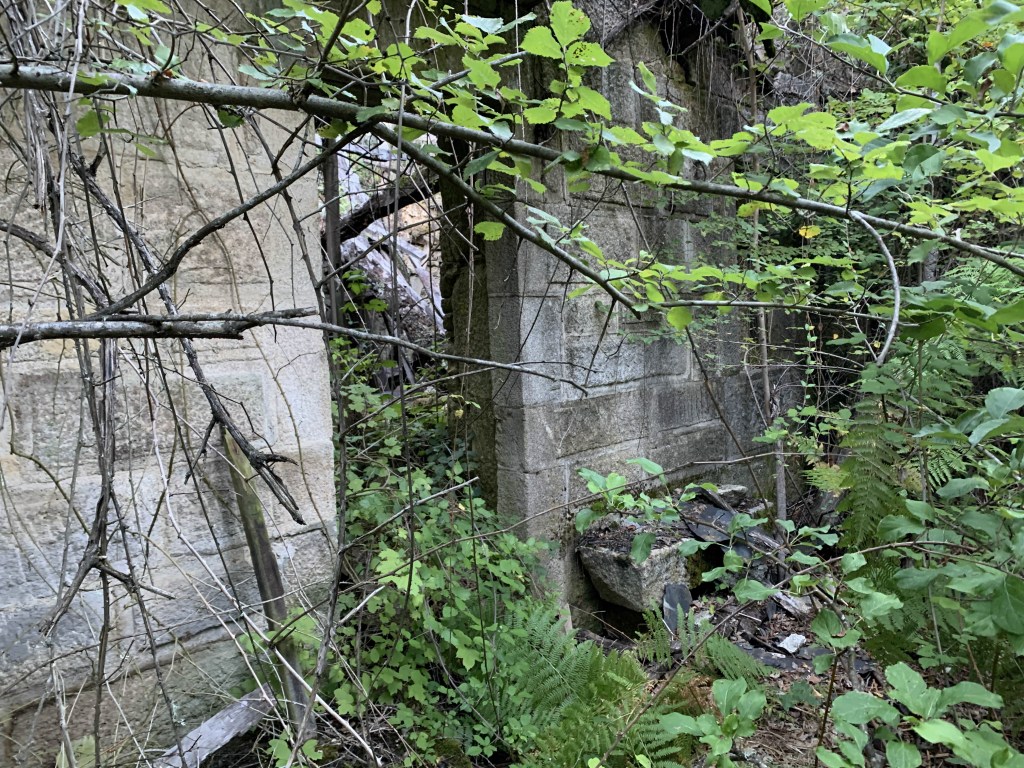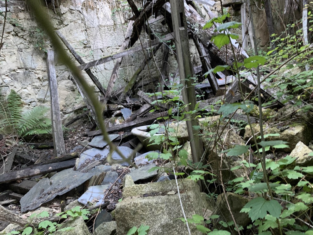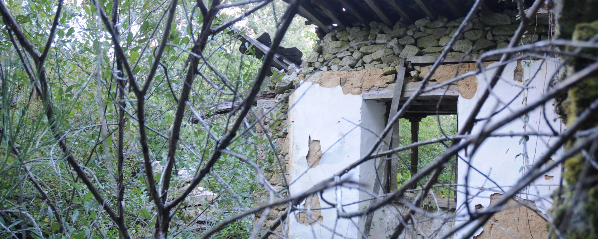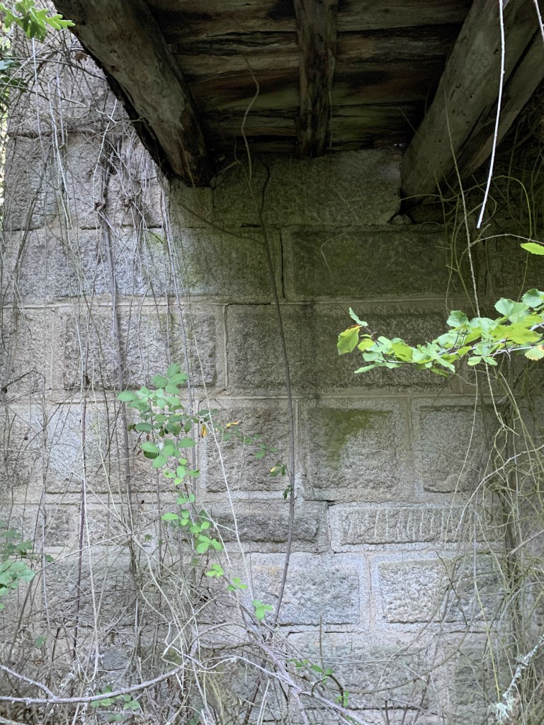 A pocos metros de la pileta, ocultas entre la vegetación, se pueden ver las ruinas de la antigua edificación: una casa de baños o balneario de dos pisos, construida en 1917, aunque resulta razonable que la explotación del manantial sea anterior. El estilo de la construcción es popular, destacando el corredor de madera de la segunda planta. La instalación debió contar con sala de vapores y dos pilas para baños, una caldera de leña calentaba el agua de las bañeras. La ficha de campo del Instituto Geológico y Minero de España nos indica que el agua «se captaba a partir de un pozo accionado por una bomba manual» dentro de la propia casa. Enterrada entre los escombros, aún se descubre una antigua bañera de piedra, similar a las que resisten el paso del tiempo junto a la surgencia de Bouzas.