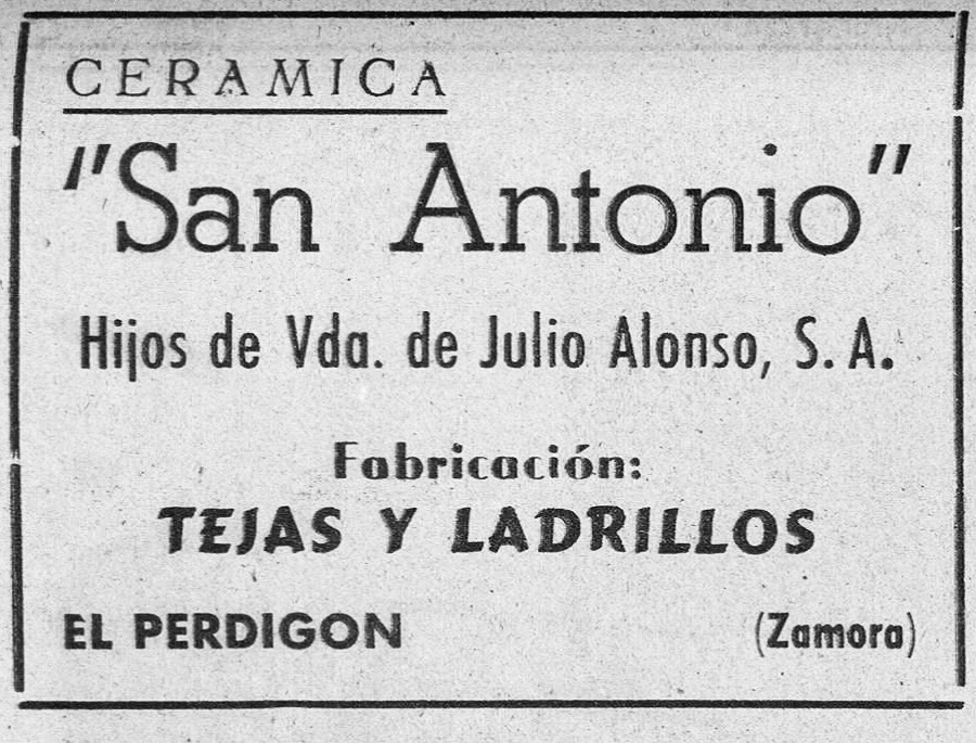 En la calle Sacramento de Zamora resisten a su desaparición completa las ruinas del edificio que ocupó el taller del escultor Ramón Abrantes hasta el final de sus días. Las columnas del cercado exterior de la vivienda están construidas en ladrillo y en los laterales del extremo superior pueden verse varias piezas con inscripciones de fábrica donde se lee: “PERDIGÓN ZAMORA” y “SAN ANTONIO”. Este detalle, apreciable también en algún otro edificio de la ciudad, nos traslada a poco más de 10 kilómetros de distancia de la ciudad.
