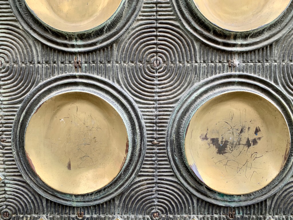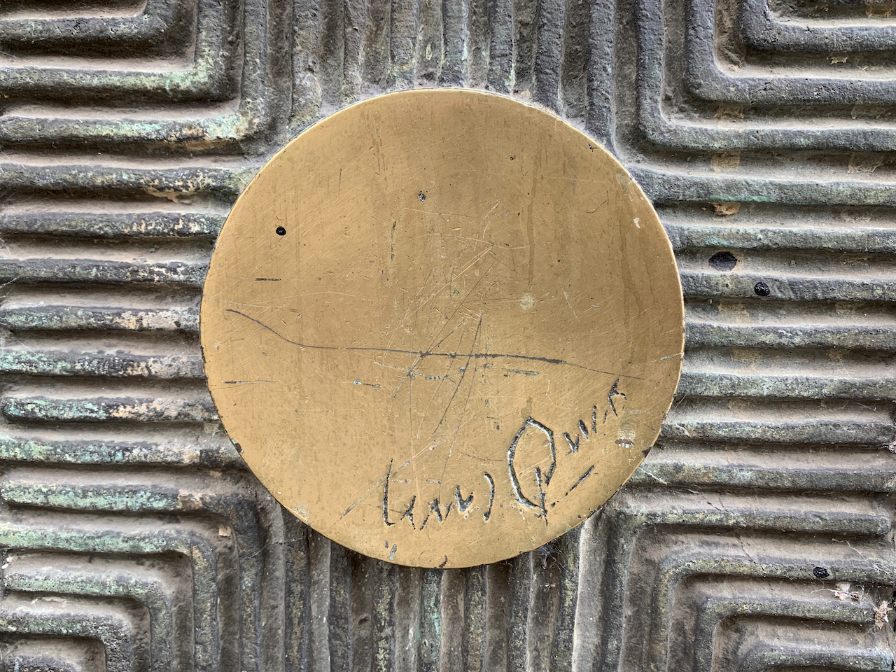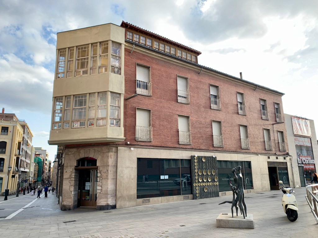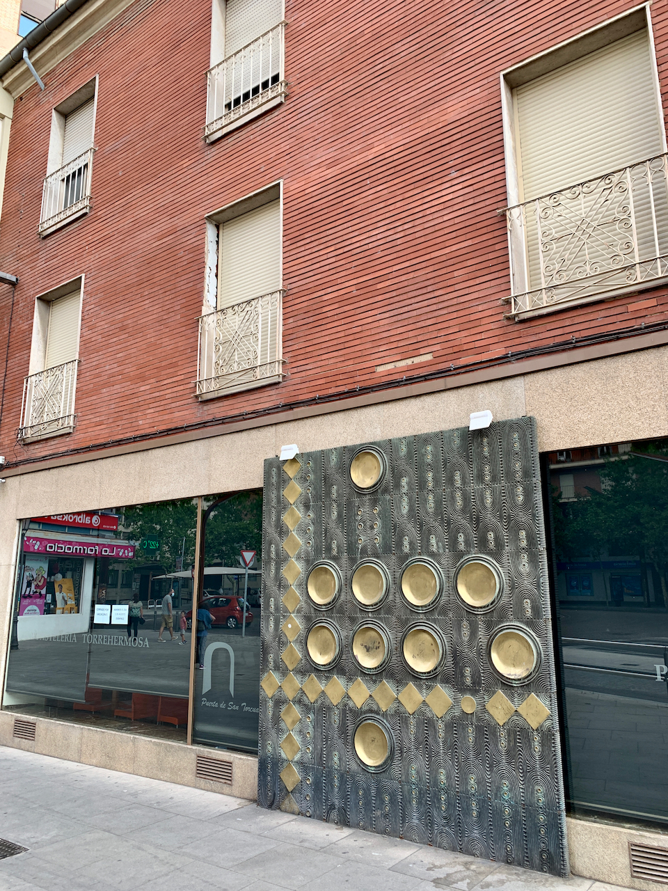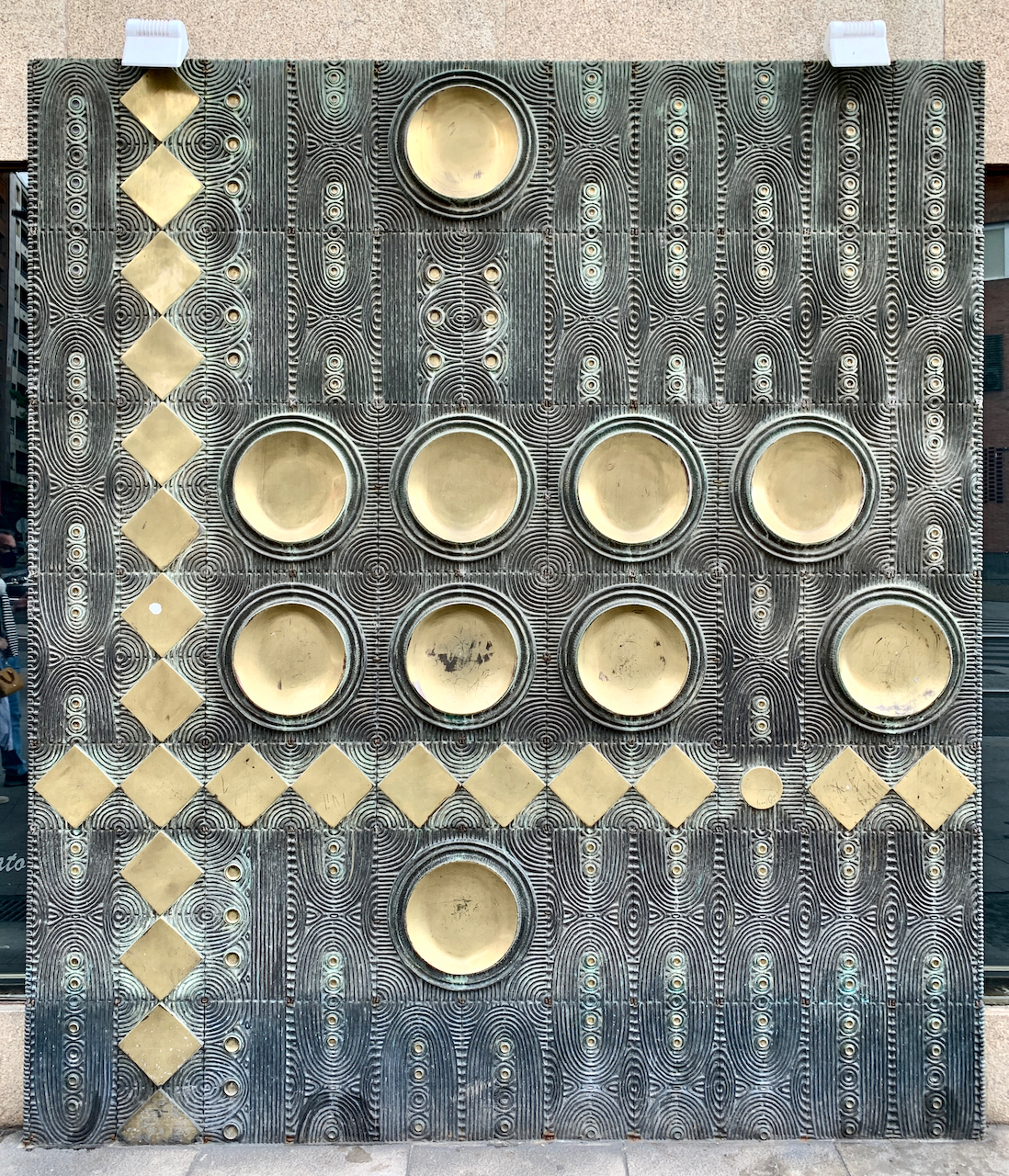 Mural escultórico en el local del antiguo comercio textil «García Casado», hoy Cafetería-Pastelería «Torrehermosa – Puerta de San Torcuato». Calle San Torcuato, 45; Zamora. Luis Quico (Zamora, 1931 – Zamora, 2008)Firma del autor en una de las figuras circularesVista general del inmueble