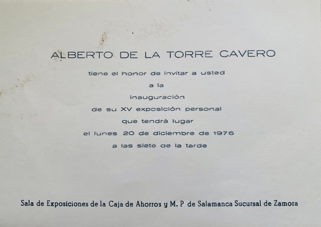 OBRASInvitación exposición 1976 Invitación a la exposición del pintor Alberto de la Torre Cavero (1938-1985) en la Sala de Exposiciones de la Caja de Ahorros y M.P. de Salamanca en Zamora. Año 1976. Tarjeta ilustrada con la obra «Pavo Real» (1976) Rotuladores. 1,05 x 0,75 m. Compártelo: Haz clic para compartir en X (Se abre en una ventana nueva) X Haz clic para compartir en Facebook (Se abre en una ventana nueva) Facebook Me gusta Cargando... Relacionado
