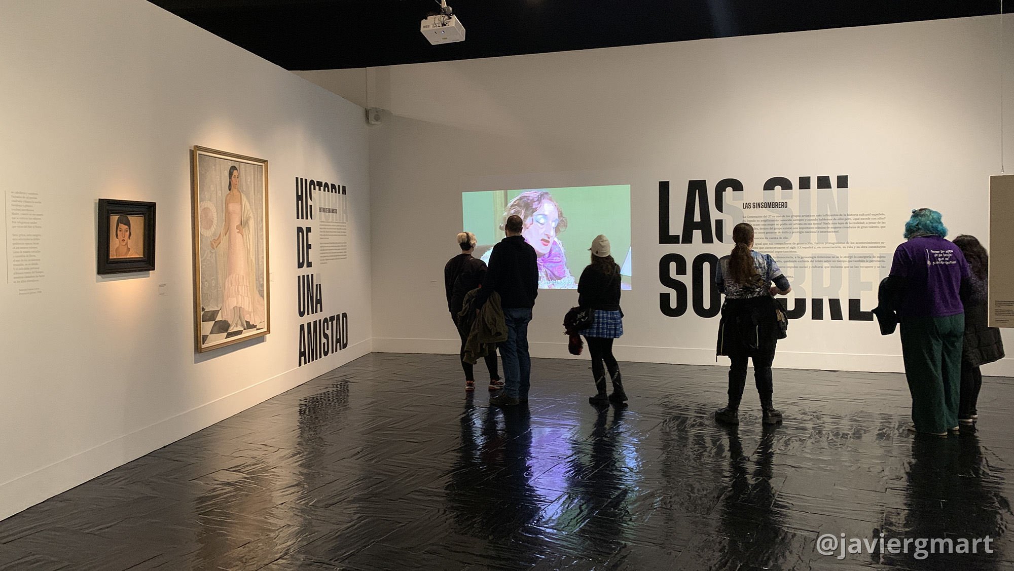 Unas declaraciones de la artista Maruja Mallo en una entrevista emitida en 1980 en Televisión Española reciben al visitante a la vez que justifican el nombre de la exposición: «las sinsombrero». Según cuenta la pintor gallega, estando paseando por la Puerta del Sol junto a Dalí, Lorca y Margarita Manso decidieron quitarse el sombrero, gesto de rebeldía que fue respondido con insultos.