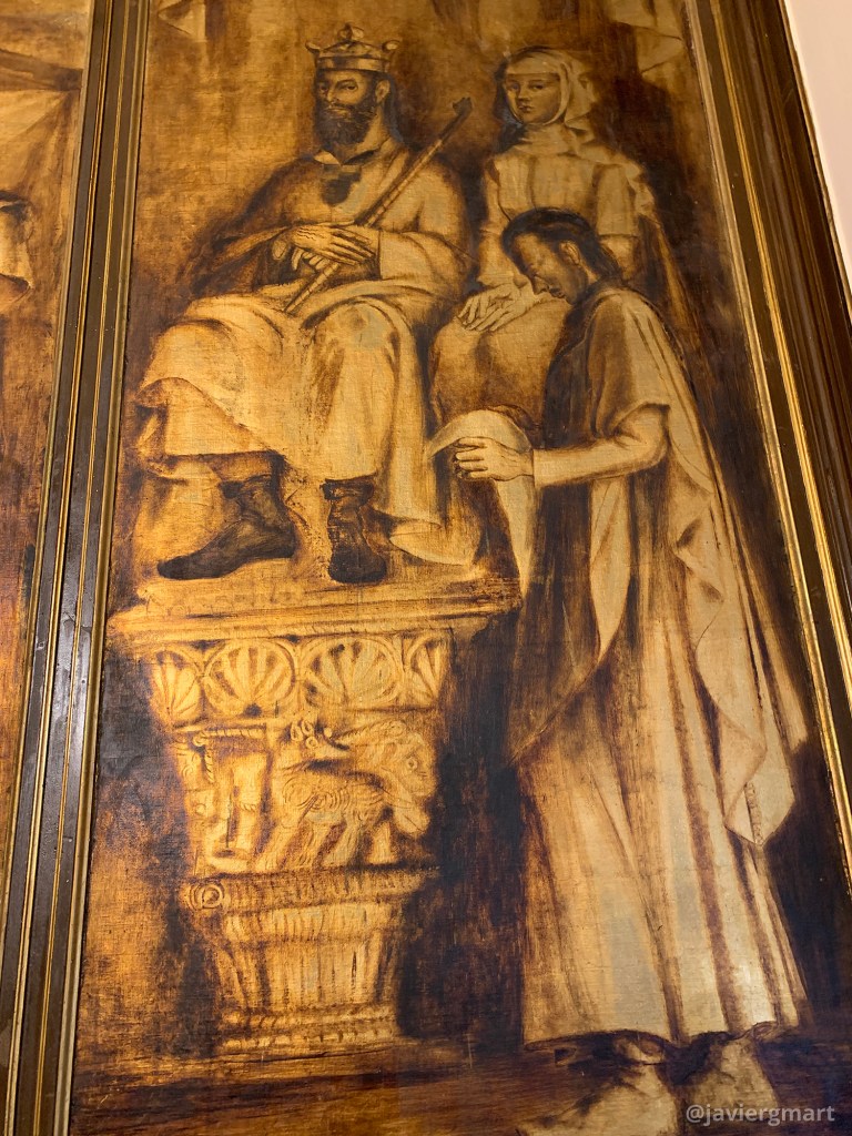 Detalle del lienzo derecho. Rey Fernando I, con su cetro, sobre un capitel de la iglesia zamorana de Santiago de los Caballeros. A su lado, su esposa Doña Sancha y un clérigo.
