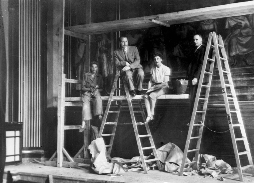 El alcalde de Zamora, Pérez Lozao (segundo por la izquierda), posa junto a Delhy Tejero ante el mural durante el proceso de colocación en el Ayuntamiento de Zamora. Archivo Mª Dolores Vila Tejero.