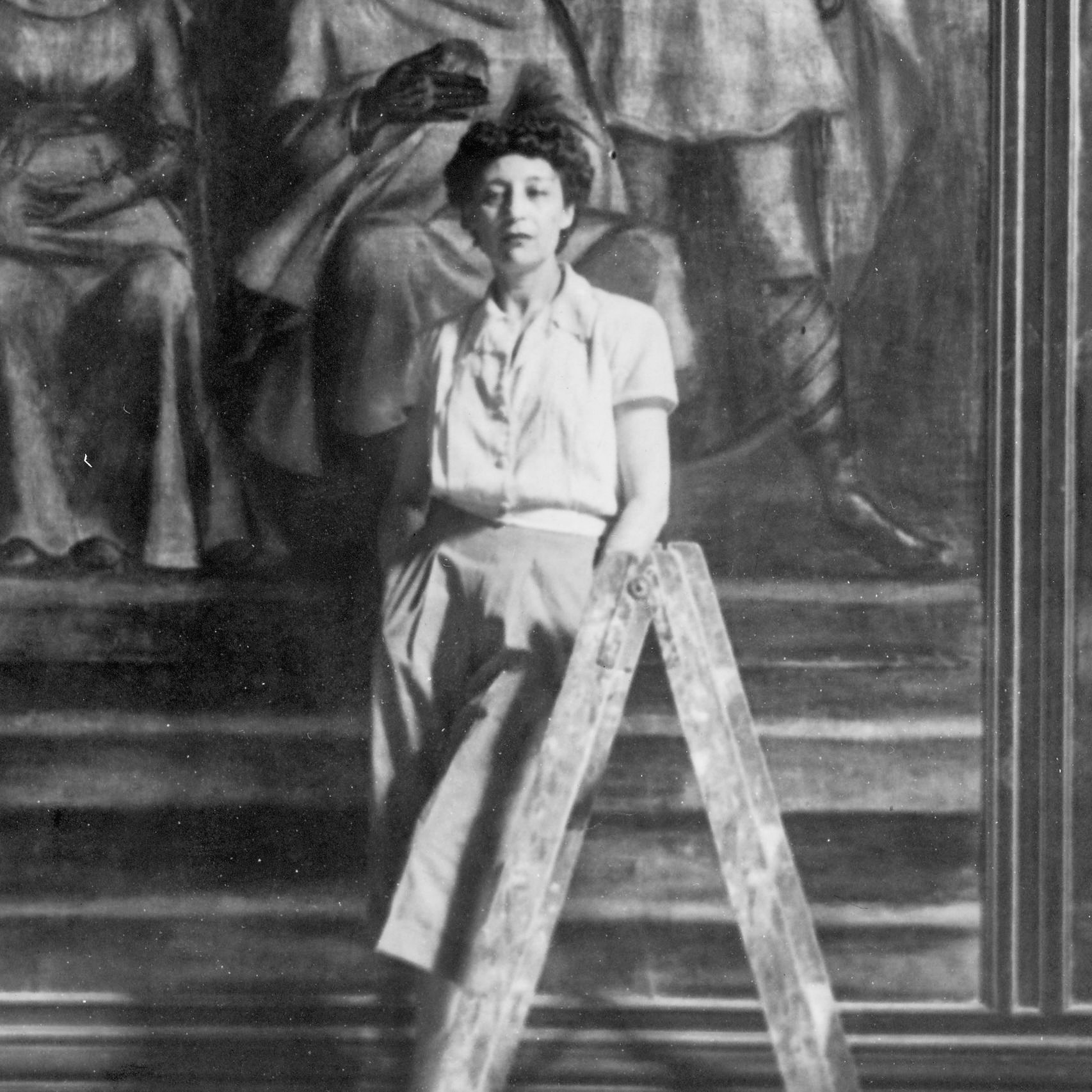 «Doña Elvira» (1948). Apunte inacabado para el mural. Óleo sobre cartulina. Catálogo de la exposición «Delhy Tejero: una muchacha y una maleta» (1998).