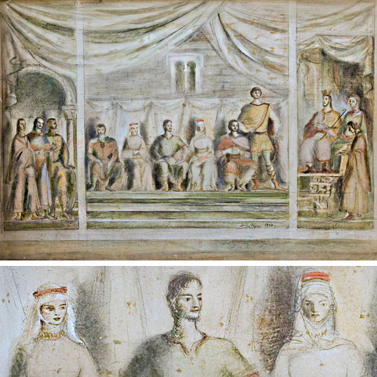 «El Cid» Boceto (1948) Pintura al fresco 50×31 cm. Catálogo de la exposición «Delhy Tejero: una muchacha y una maleta» (1998).