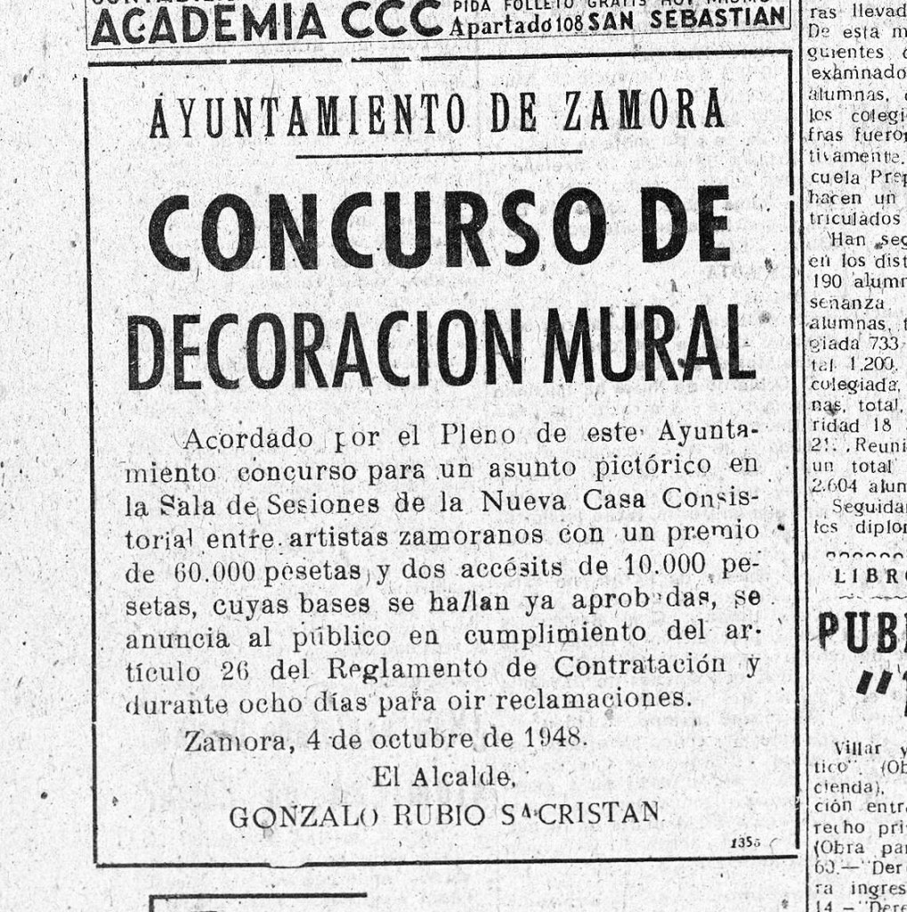 Anuncio del concurso de decoración mural del Salón de Sesiones de la Nueva Casa Consistorial publicado en el Diario Imperio el 5 de octubre de 1948