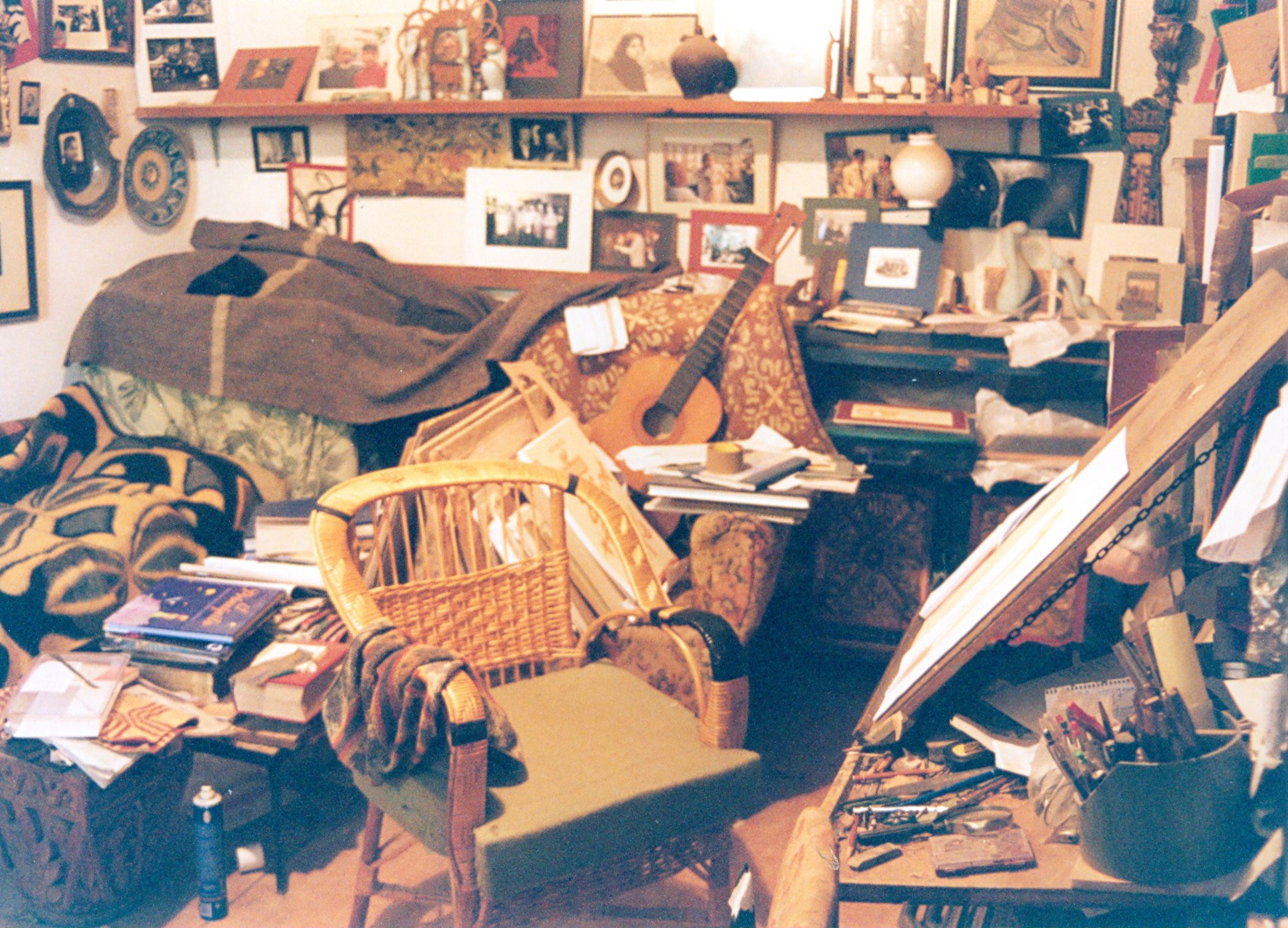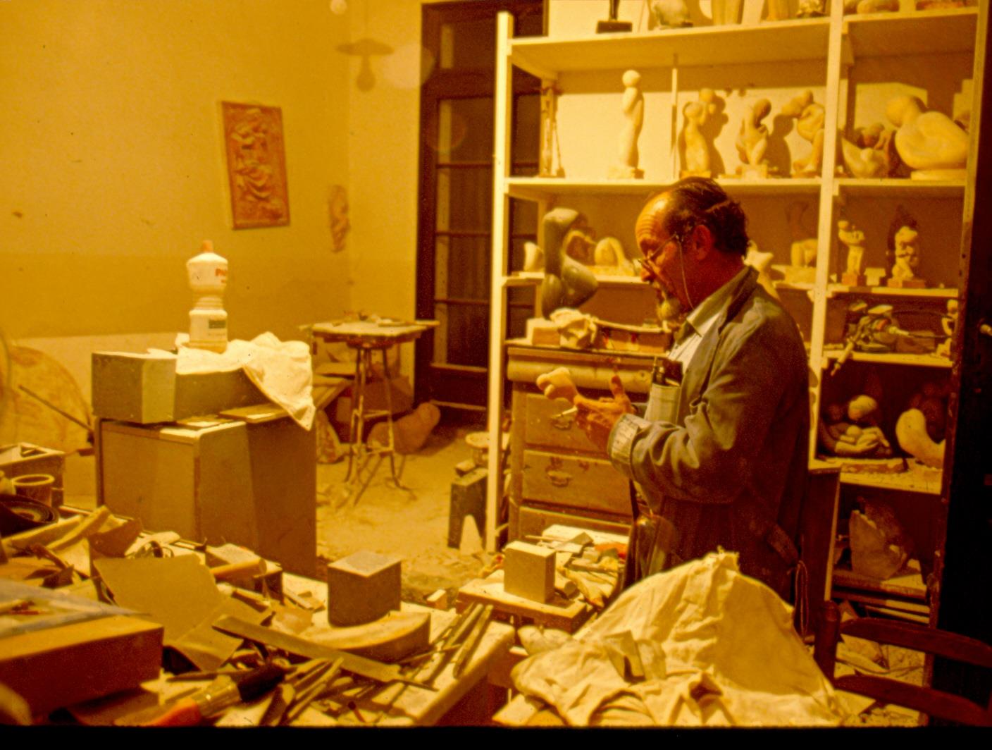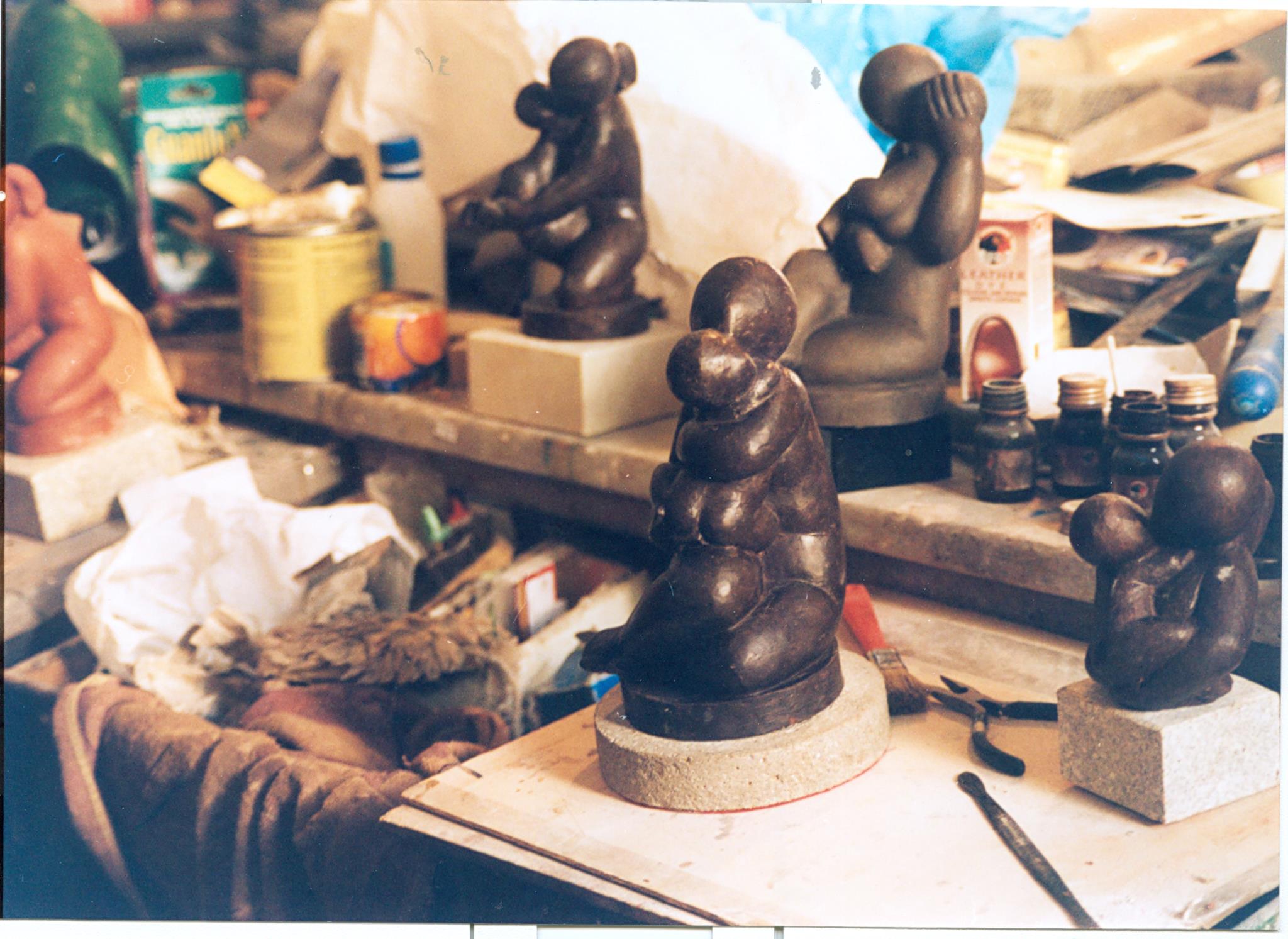 -Esta es una sala que yo uso pa picar piedra y hacer vaciados e incluso pa sacar alguna terracota. Como véis voy acumulando toda esa cantidad de modelos que ya han venido de la fundición. Hay cosas incluso que no modelo, por ejemplo ésto está hecho directamente sobre escayola para mandarlo a la fundición.