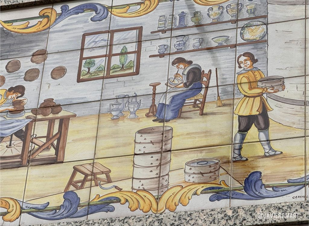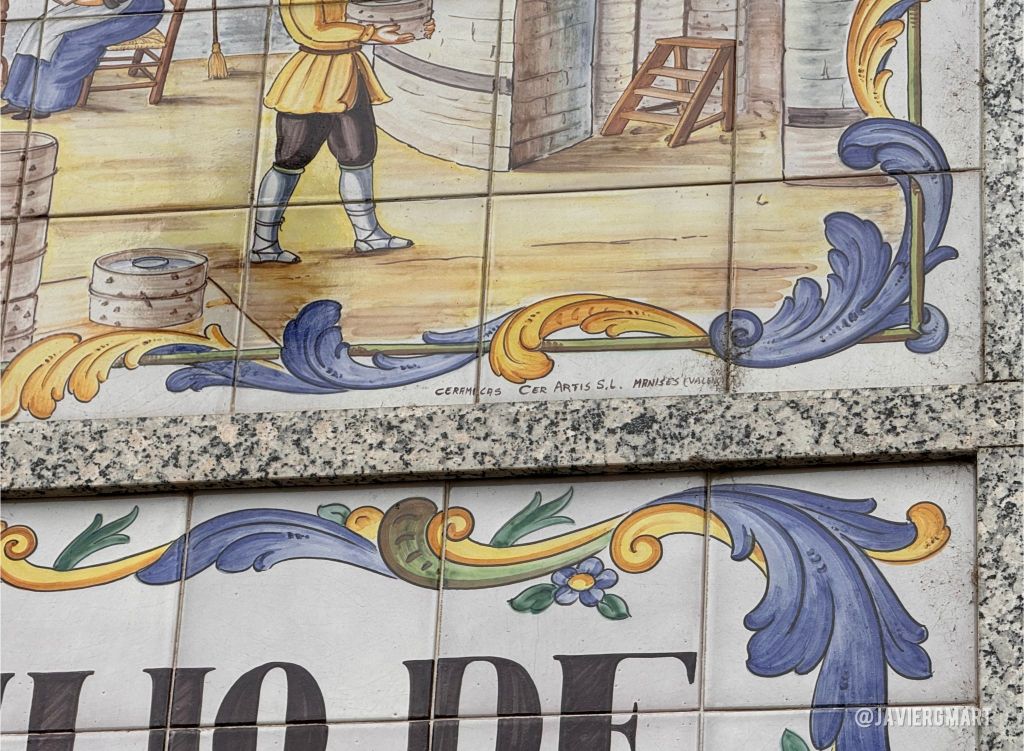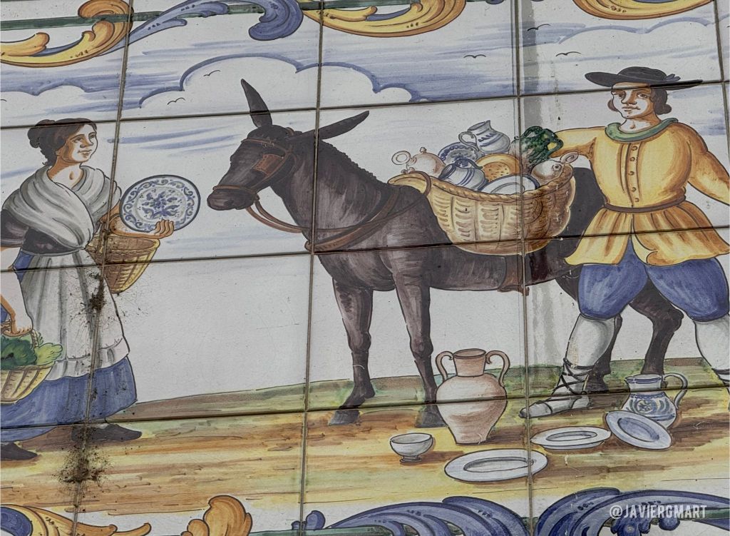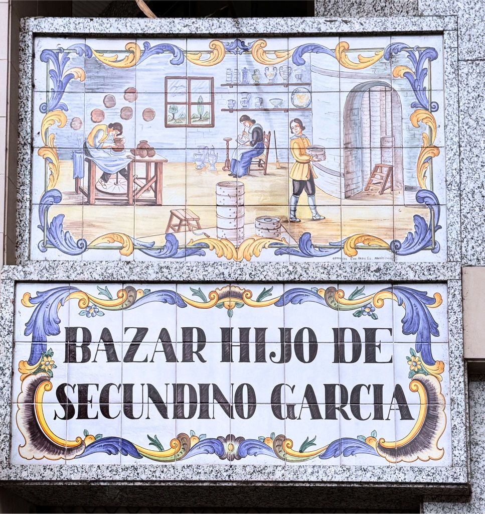 Sobre la puerta del comercio lucen cuatro azulejos cerámicos pintados a mano que fueron realizados por el taller Cerartis de Manises (Valencia). Dos de ellos retratan escenas alusivas al negocio de la alfarería, el que da a la Plaza del Mercado al modelado, cocción y pintado de las piezas, y el que da a la calle Alfonso III el Magno a la venta de los cacharros. Los otros dos azulejos anuncian el nombre del establecimiento. La ornamentación de los azulejos se inspira en los motivos de la cerámica tradicional valenciana del siglo XVIII.