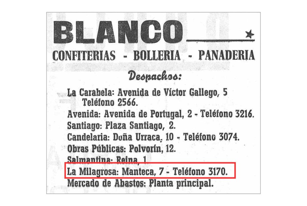 En el número 7 de la calle Manteca de Zamora, en pleno Barrio de La Horta, con acceso también desde la calle Baños, existió la panadería «La Milagrosa» . Nos lo recuerda el rótulo que permanece pintado sobre la fachada de la calle Baños que da para lo que hoy es un enorme solar vacío. En la fachada de la calle Manteca existía hasta hace poco otro rótulo de idéntica tipografía.
