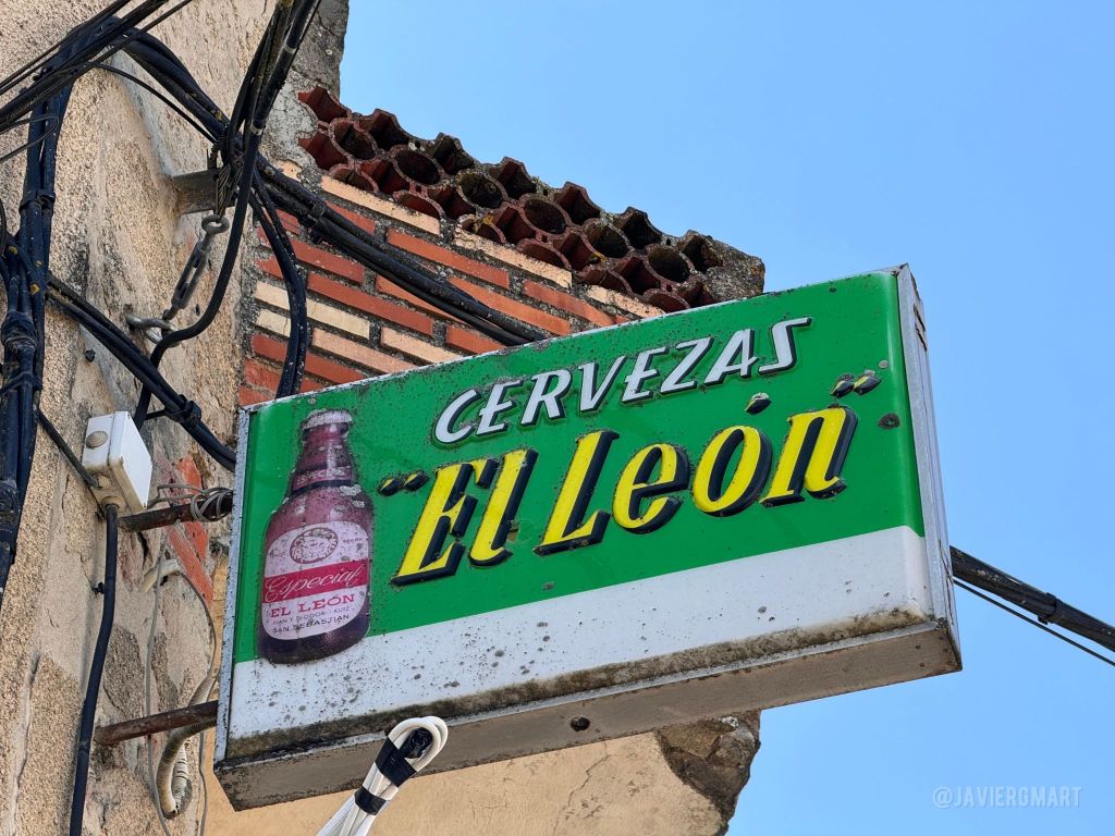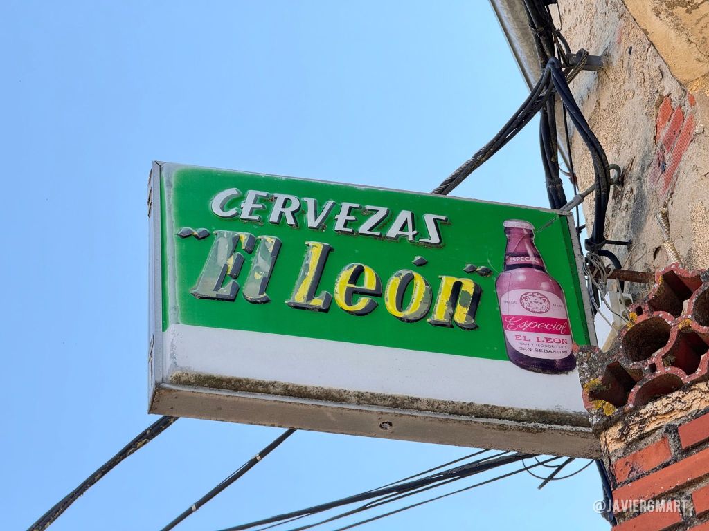 CERVEZAS «El León». Rótulo en caja de luz en una antigua tienda de comestibles y estanco de la calle Escobas de Torregamones (Zamora). Esta marca de cervezas fue creada en San Sebastián en 1965 de la mano de los hermanos Juan y Teodoro Kutz, miembros de una familia alemana cervecera que levantó una fábrica de cervezas en el barrio donostiarra de Ategorrieta en 1872. La empresa fue absorbida en los 80 por el grupo Cruzcampo y este a su vez por Heineken. La marca más popular fue Keler, hoy en día en manos del grupo Damm.