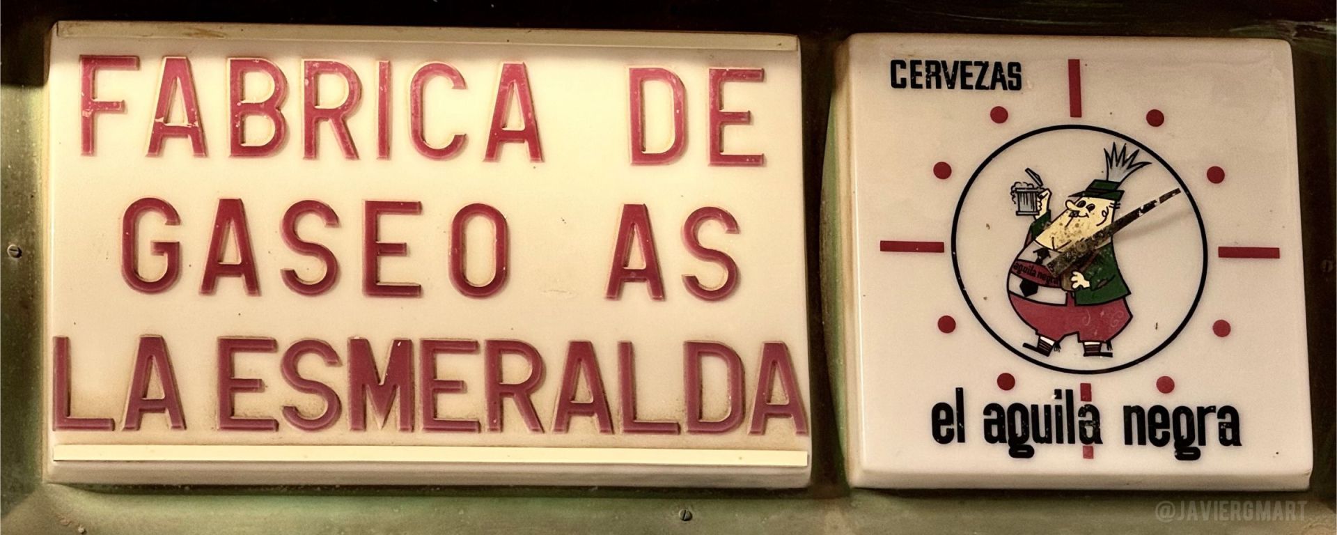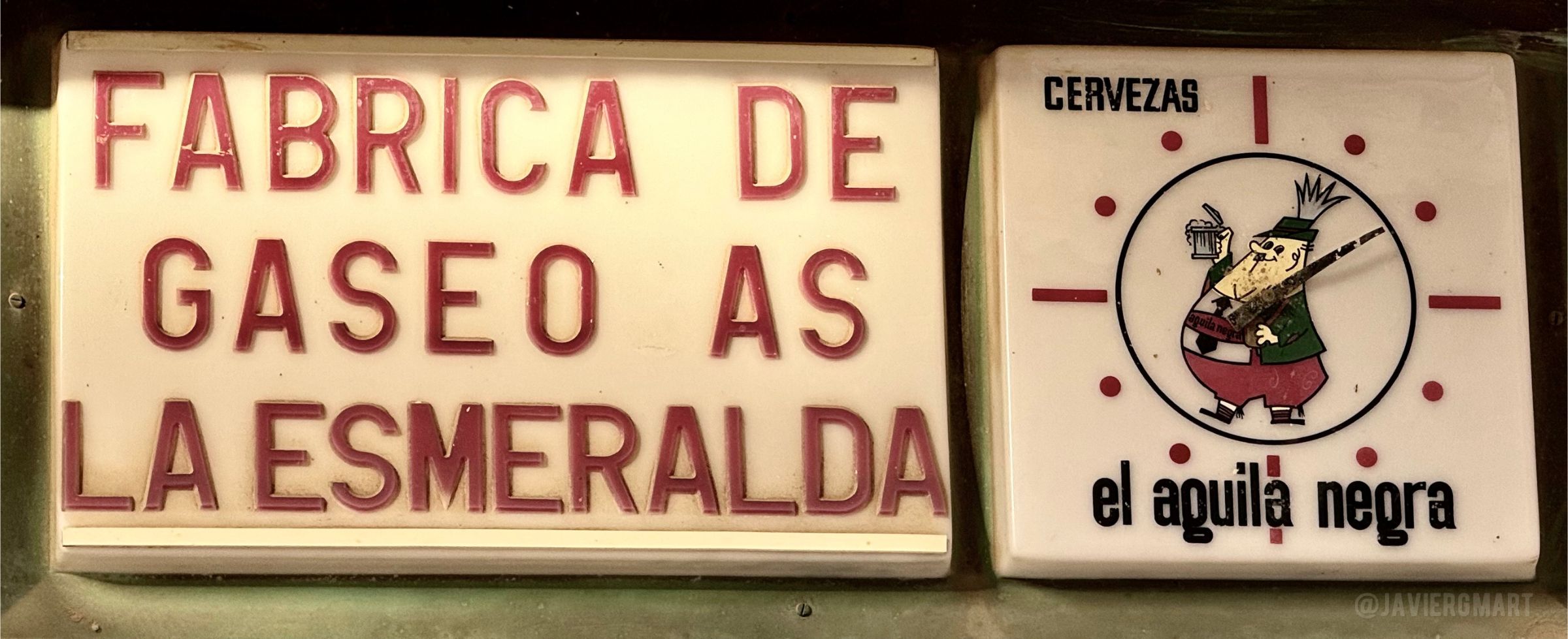 Rótulo de la antigua fábrica de gaseosas «La Esmeralda» de Fuentesaúco (Zamora) y reloj publicitario de la empresa asturiana Cervezas «El Águila Negra» (produjo hasta 1993). Establecimiento cerrado.