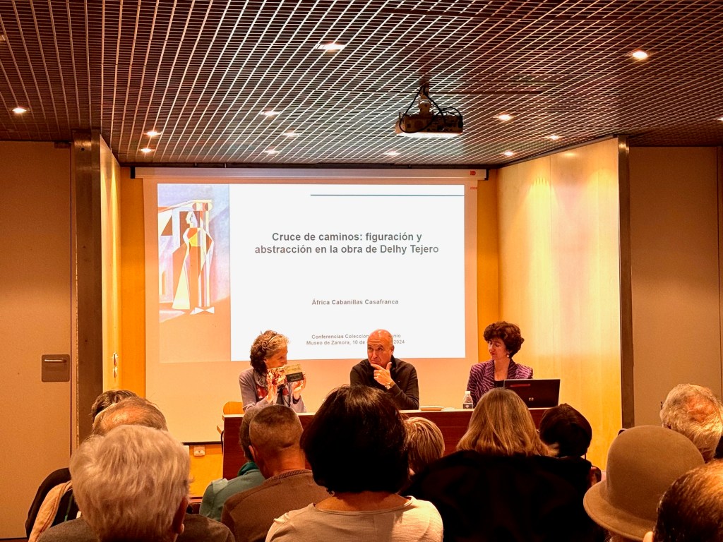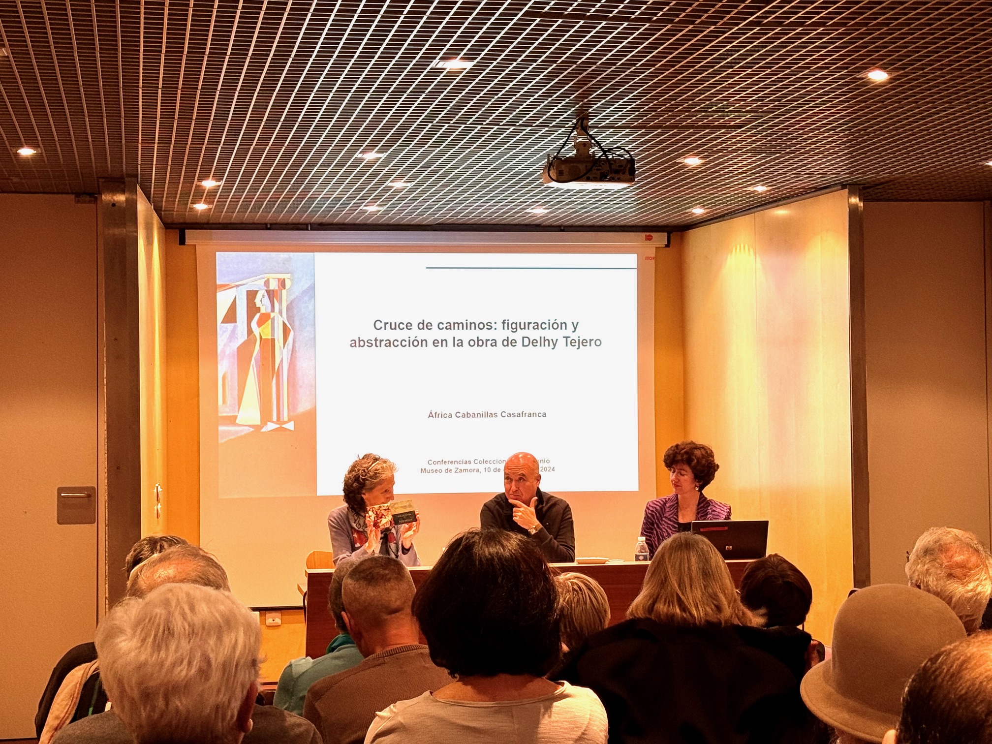 La intervención de África Cabanillas titulada «Cruce de caminos: figuración y abstracción en la obra de Delhy Tejero» incidió en esta dualidad presente en la obra de la pintora a lo largo de su vida. En concreto, relató cómo llegó Delhy a la abstracción tras visitar dos exposiciones, la confección en 1943 de su primera obra abstracta conocida y cómo esta vertiente rompedora fue ocultada por la corriente imperante: «La obra de Delhy es original y experimental como pocas en el siglo XX. En el caso de las mujeres se veía como algo negativo, ha habido una mirada prejuiciada sobre la obra de Delhy hasta hace poco», afirmó Cabanillas.