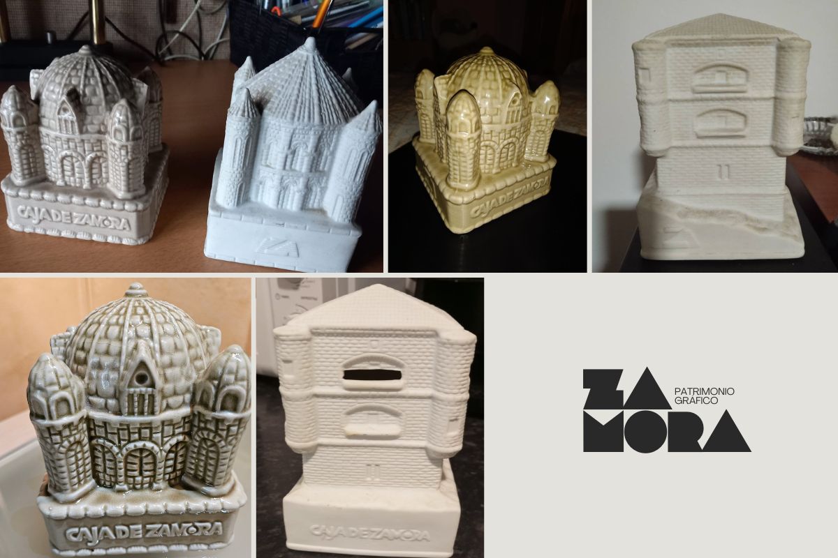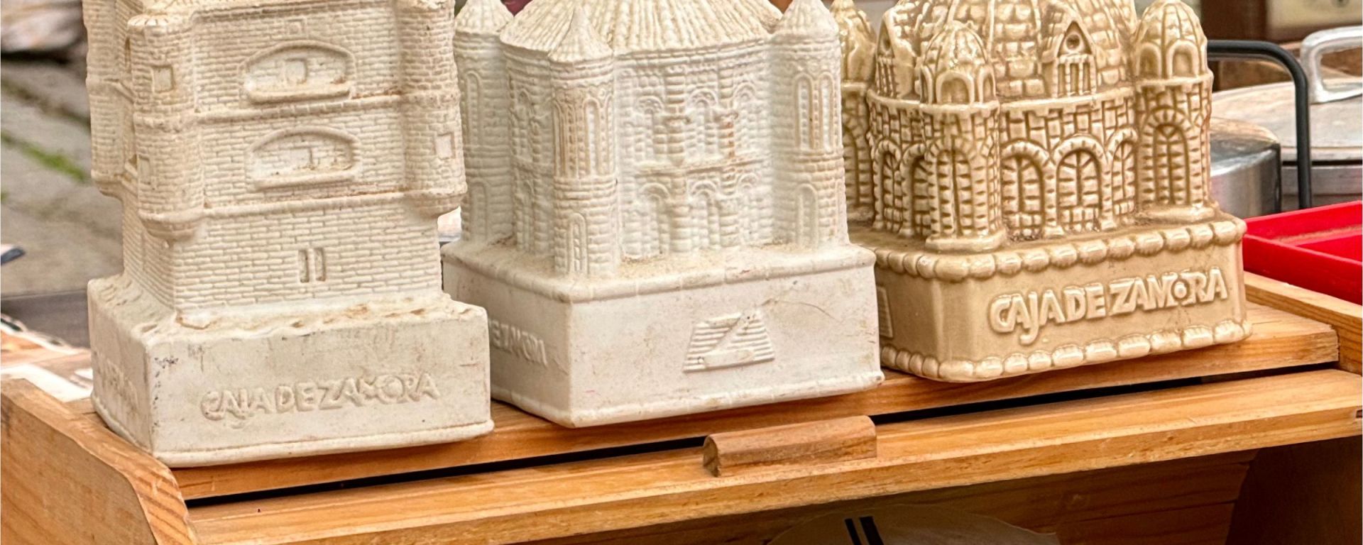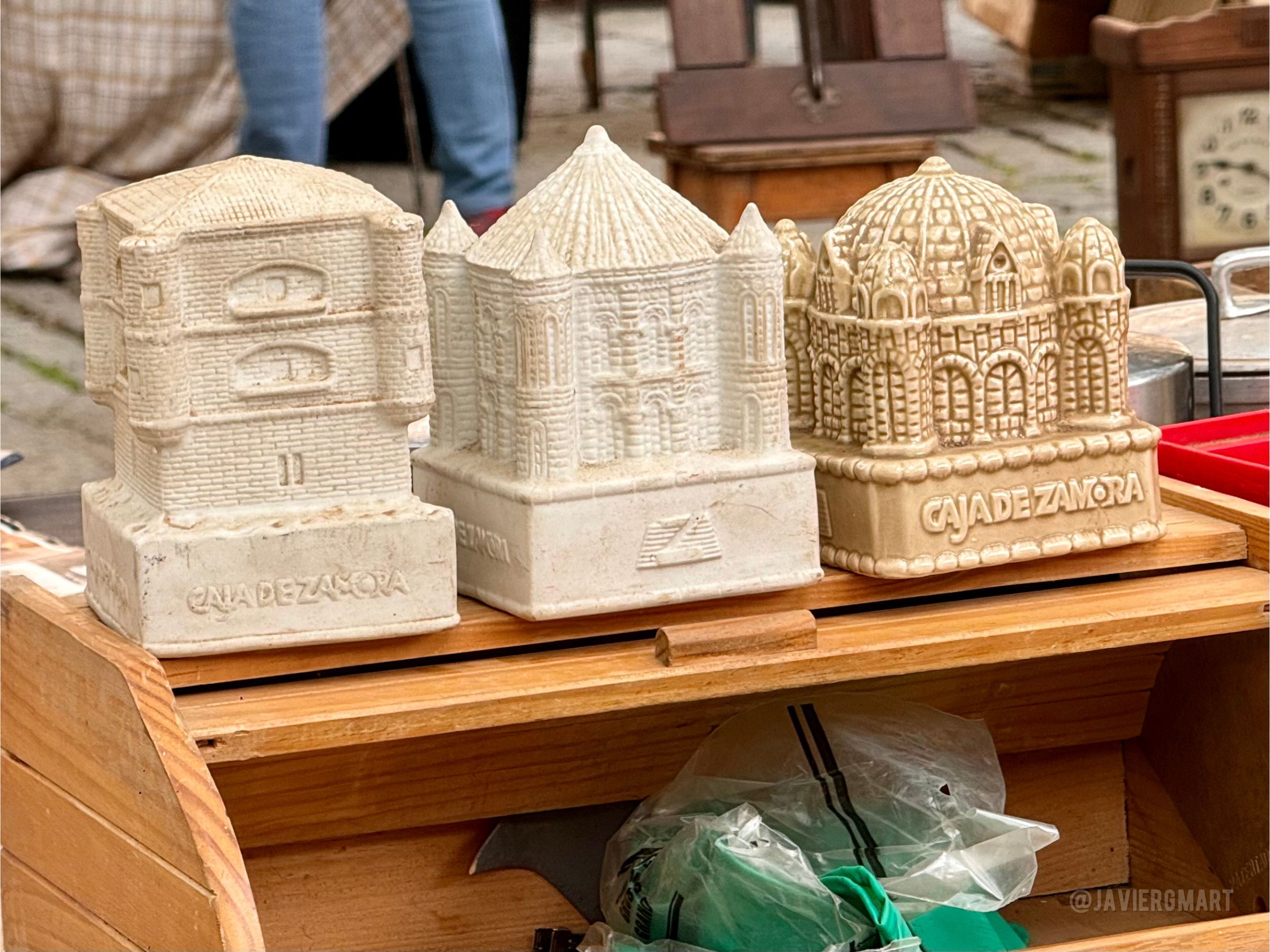Huchas de la Caja de Ahorros Provincial de Zamora. Torre del Caracol del Castillo de Benavente, cimborrio de la Colegiata de Toro y cimborrio de la Catedral de Zamora. Fotografía realizada en el mercadillo de la Plaza de Viriato en octubre de 2024.