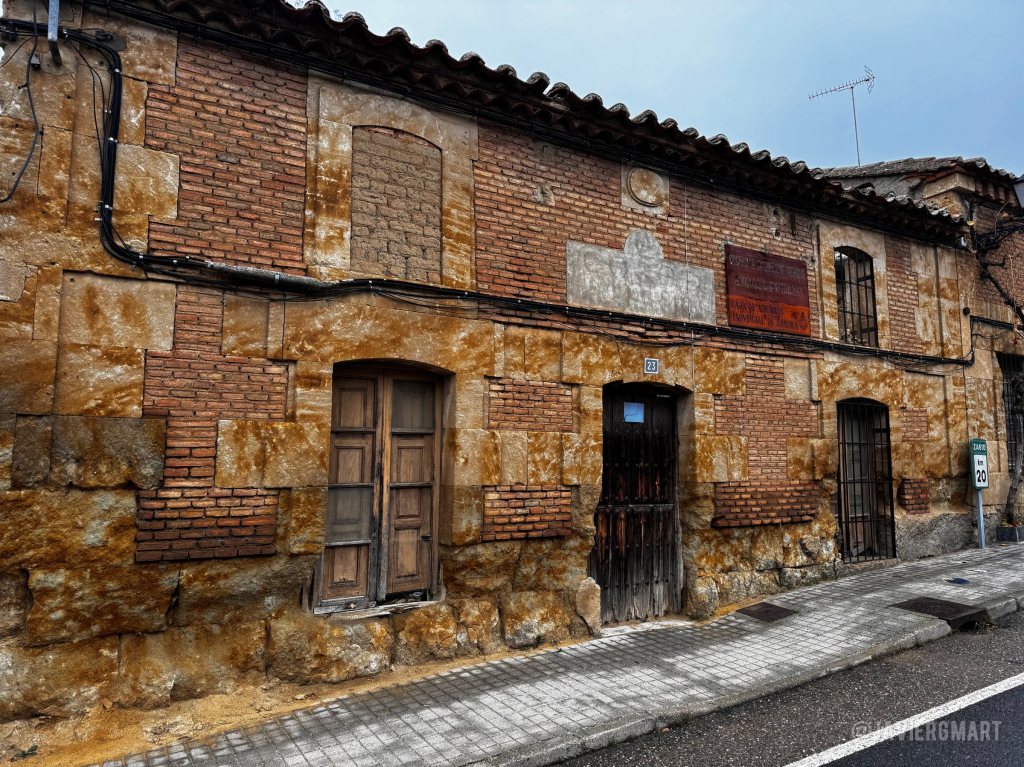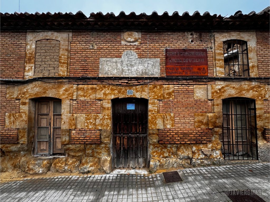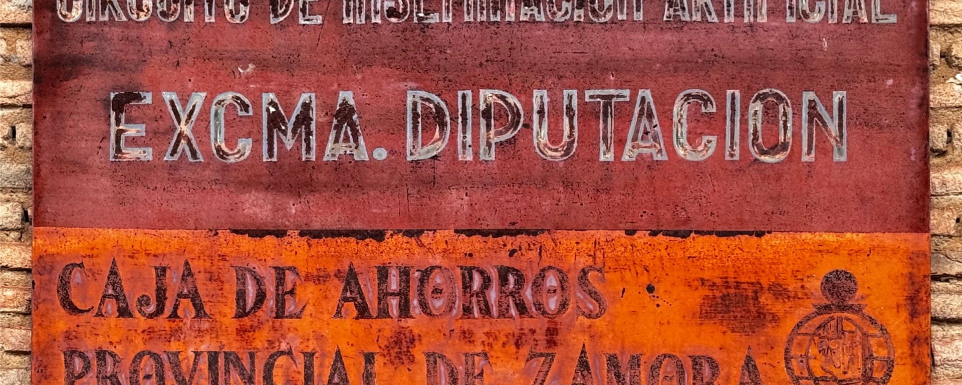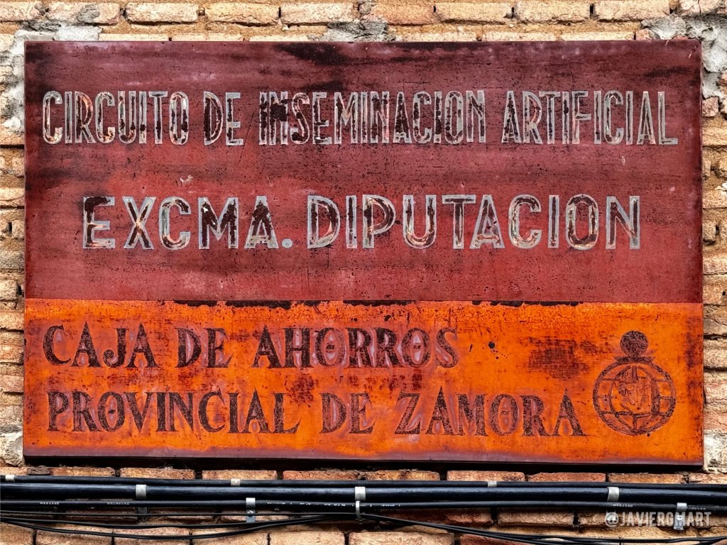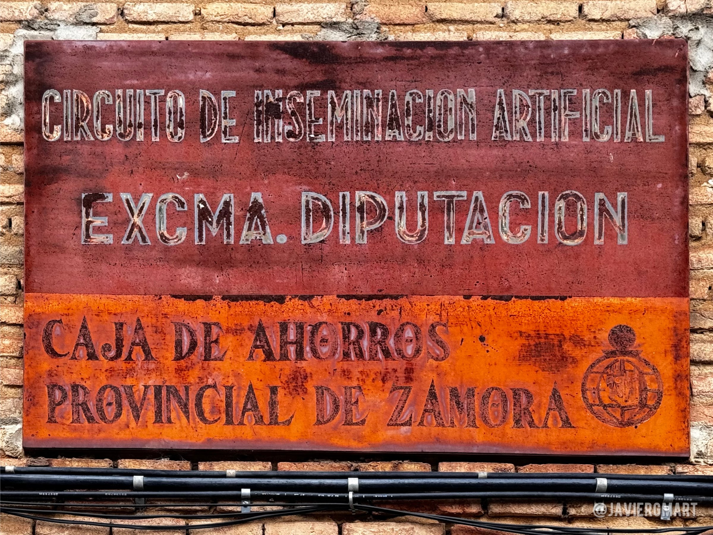 Chapa metálica con el rótulo del Circuito de Inseminación Artificial de la Excma. Diputación y de la Caja de Ahorros Provincial de Zamora. Sobre el panel central de cemento se aprecian restos del rótulo, ya casi borrado, «CASA DE HERMANDAD». Casa de Hermandad (edificio actualmente en ruinas). Calle Tajada, 23. Venialbo, Zamora.
