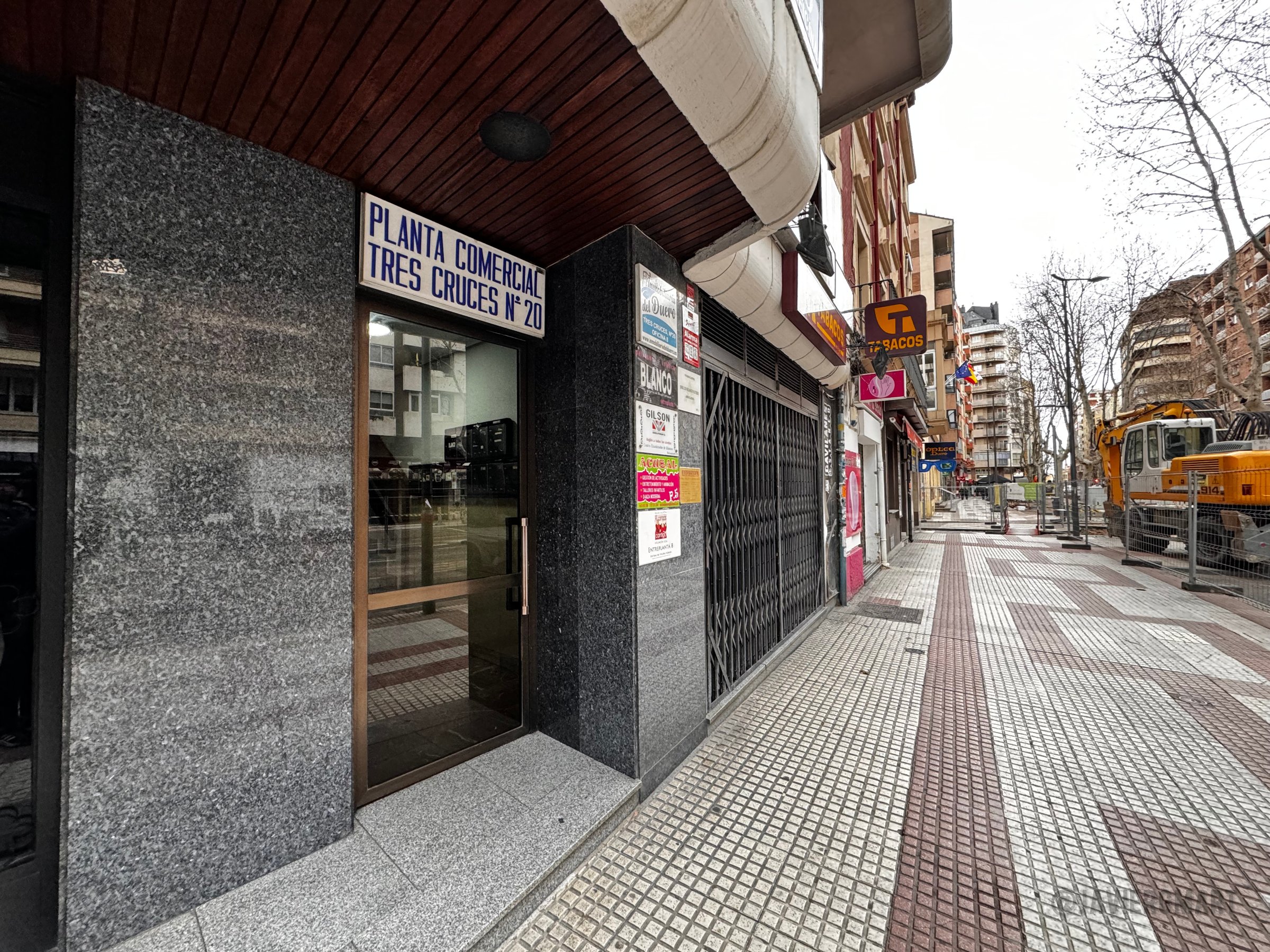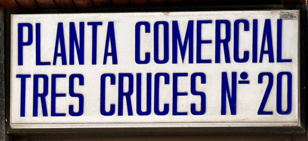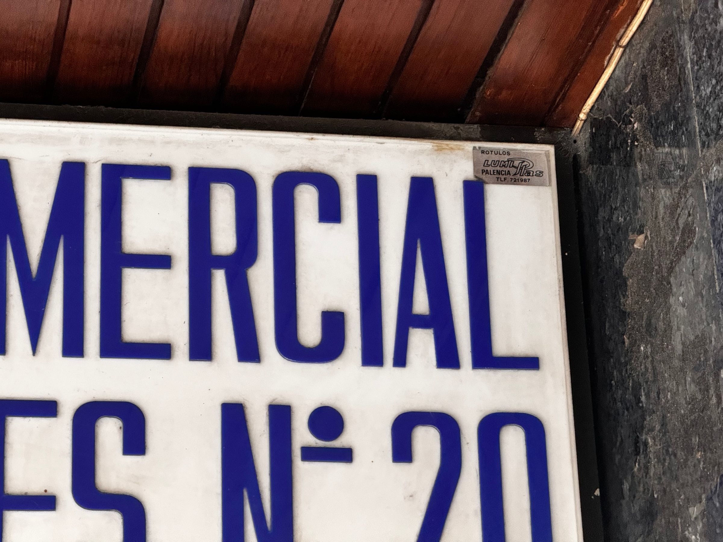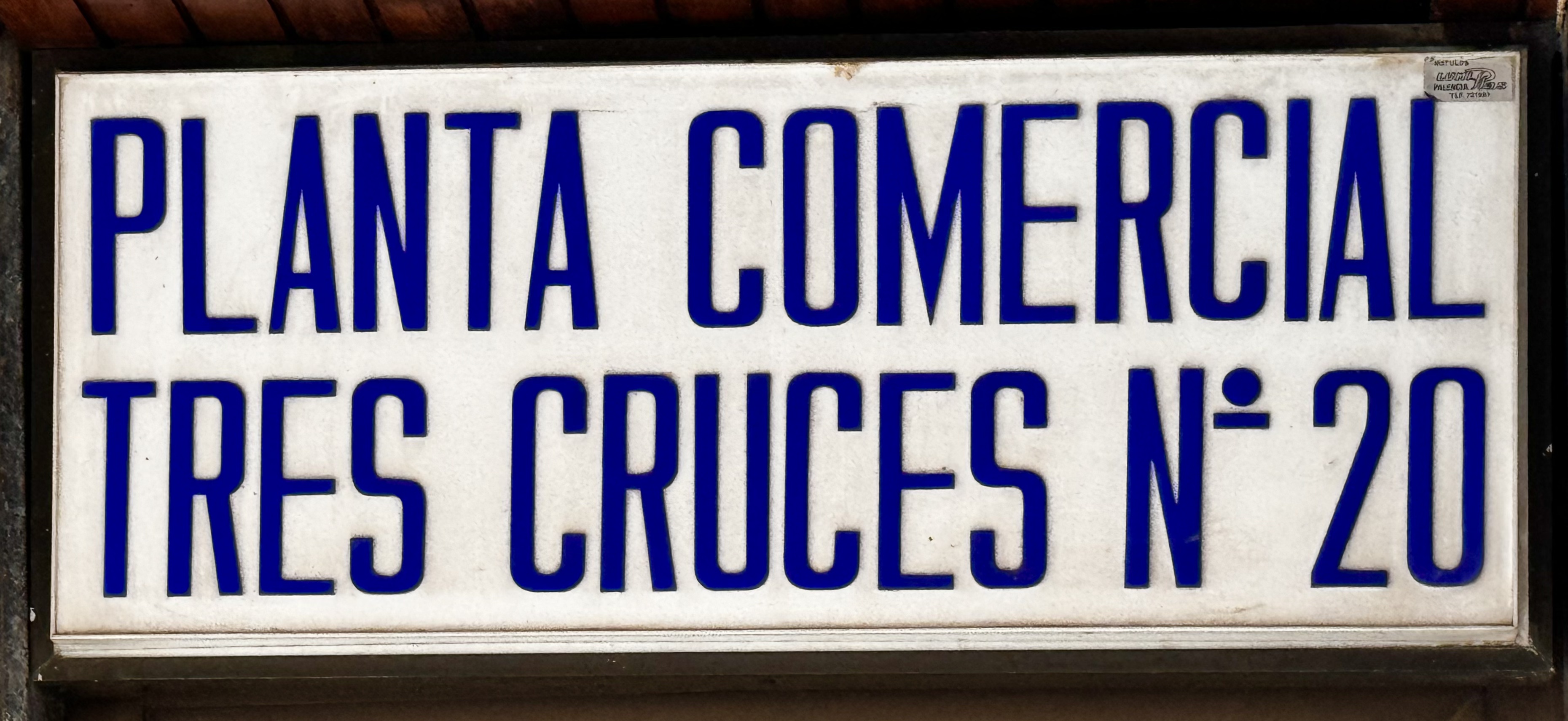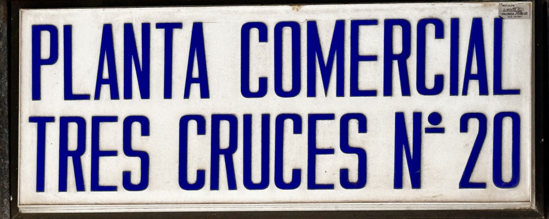 Rótulo en metacrilato sobre la puerta del acceso a «PLANTA COMERCIAL TRES CRUCES Nº 20». Avenida de las Tres Cruces, 20 Zamora. Pieza elaborada en los talleres de LUMIPLAS (Palencia).