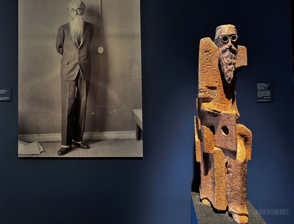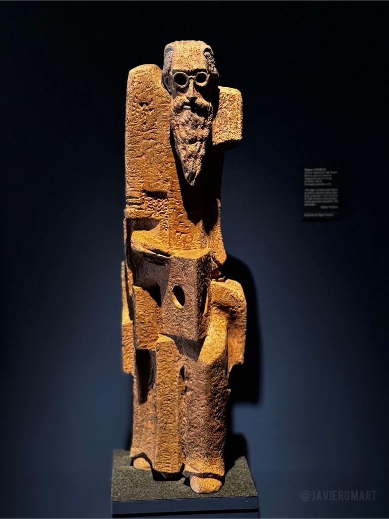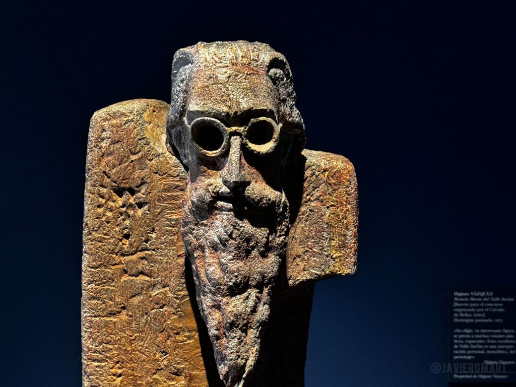 Entre las múltiples piezas artísticas que integran la exposición dedicamos esta entrada a una escultura del zamorano Higinio Vázquez García (El Pego, Zamora, 1930): el boceto de un monumento a Valle-Inclán que ya habíamos publicado en el proyecto con unas fotografías realizadas en el estudio del autor. En esta ocasión la pieza forma parte del quinto y último capítulo de la exposición madrileña que, bajo el título «La luz en el espejo», se centra en la figura del escritor Ramón María del Valle-Inclán y su obra «Luces de Bohemia».