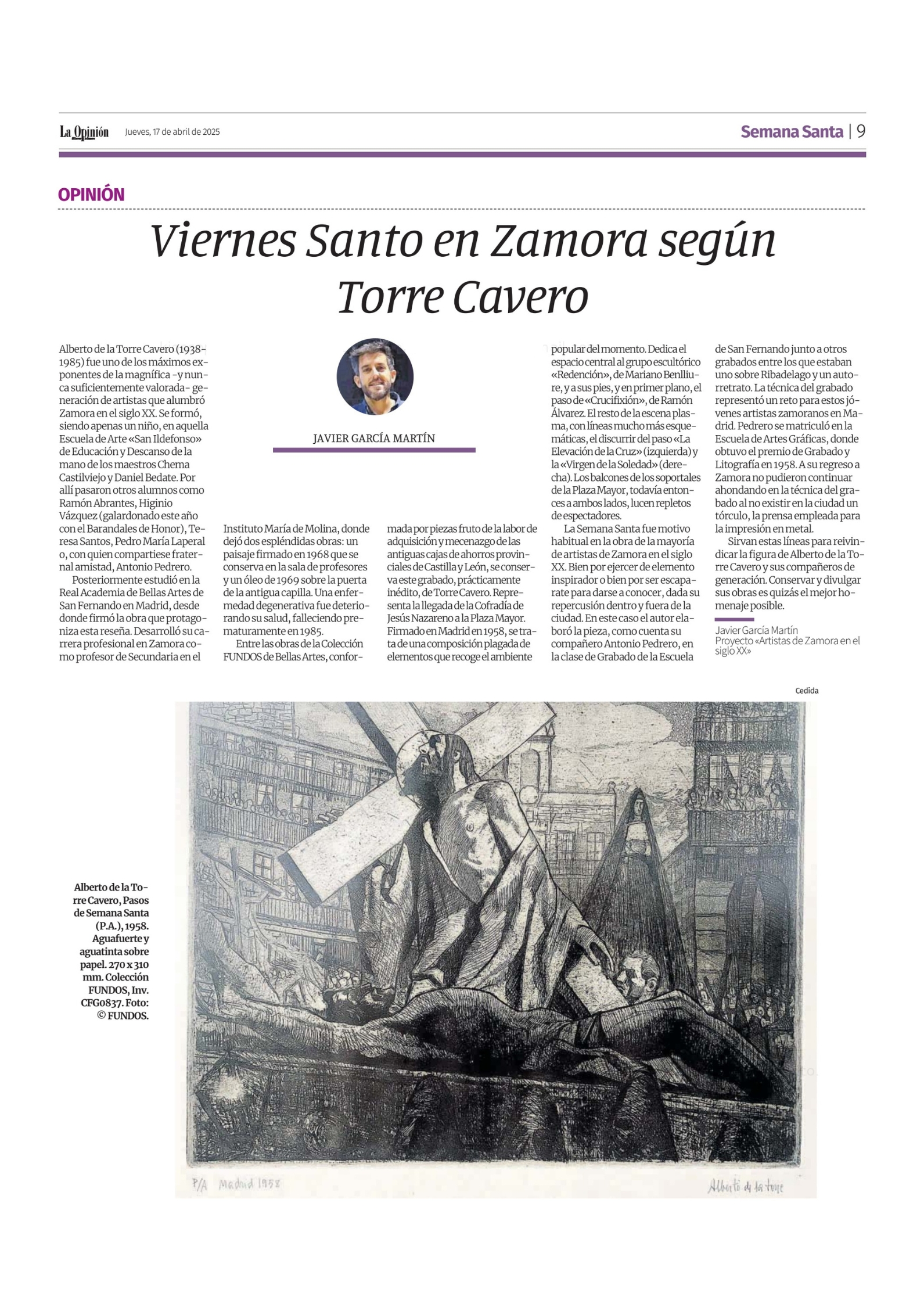 Artículo publicado el 17 de abril de 2025 en La Opinión-El Correo de Zamora sobre una pieza del artista zamorano Alberto de la Torre Cavero (1938-1985) perteneciente a la Colección FUNDOS de Bellas Artes. Edición digital del artículo aquí.