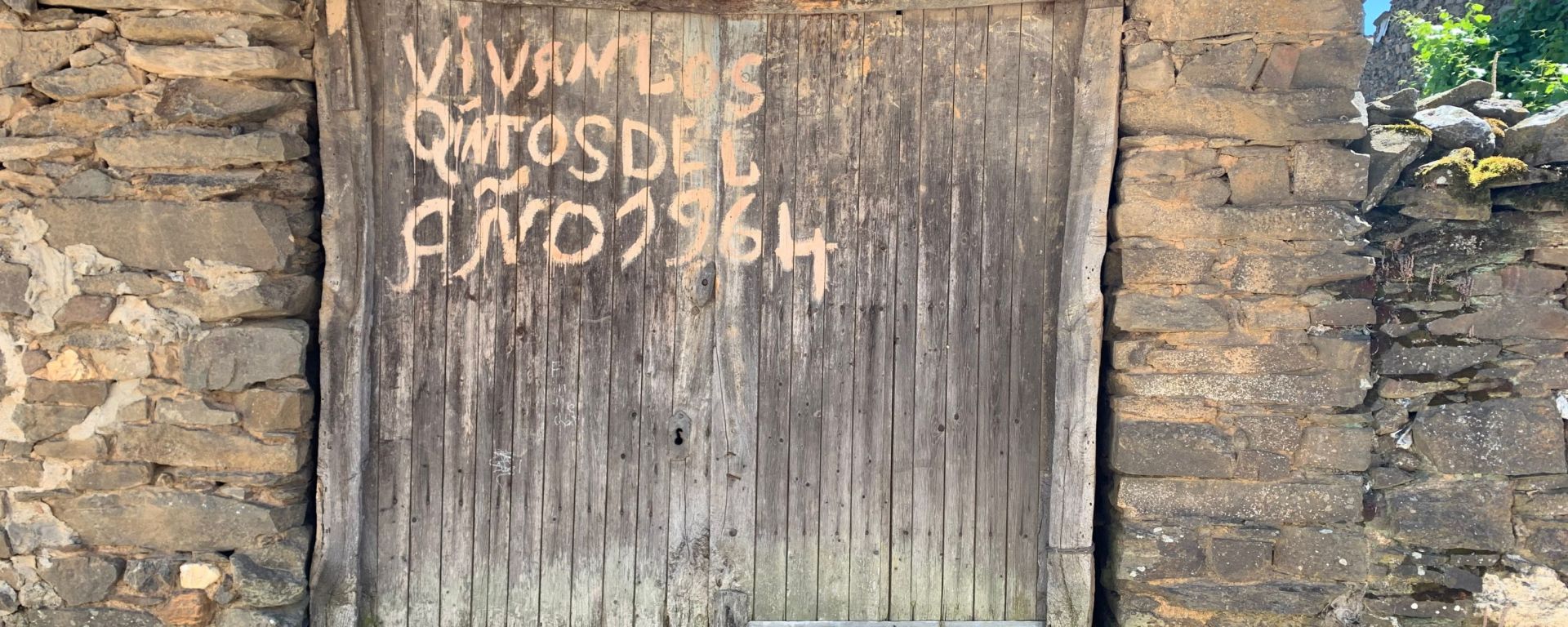 «VIVAN LOS QINTOS DEL AÑO 1964». Pintada de quintos sobre una puerta carretera de la calle Real de Grisuela (Zamora).