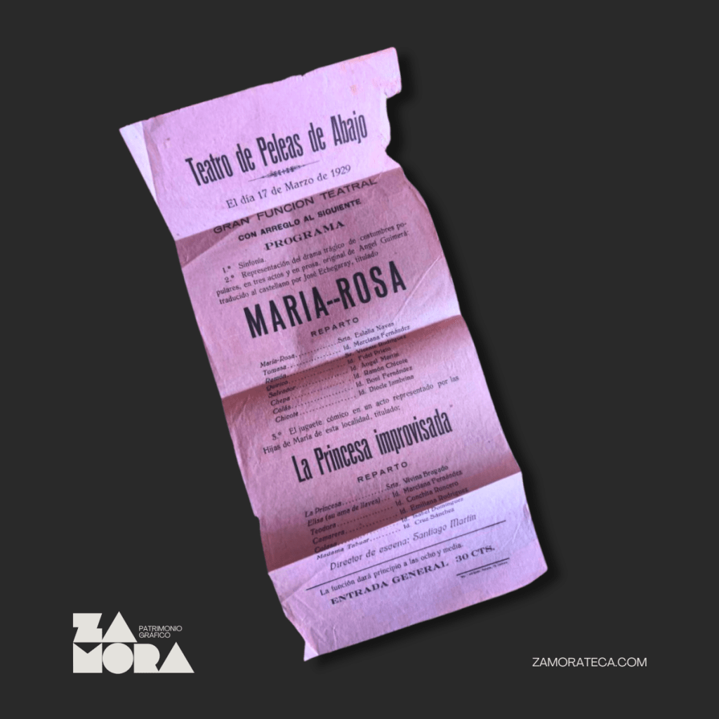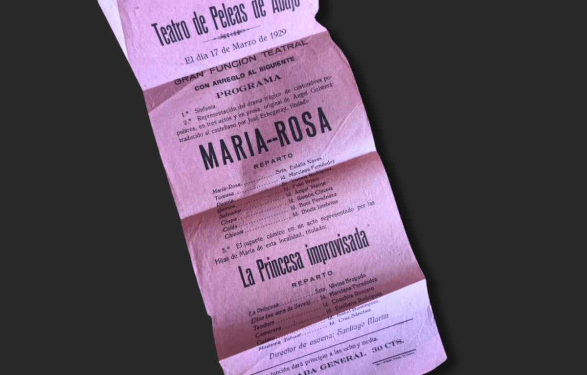 Aquella noche se ofrecieron dos obras muy diferentes, algo que era habitual en los teatros populares: primero se representaba un drama serio, y después una pieza cómica más breve, para que el público saliera con buen ánimo. La velada comenzó con “María Rosa”, un drama trágico del autor catalán Àngel Guimerà, traducido por José Echegaray, que contaba la historia de una mujer atrapada entre la pasión y la traición. Para terminar, se ofreció “La Princesa improvisada”, un juguete cómico en un acto. Este género consistía en pequeñas obras de enredo, divertidas y sencillas, que servían como “colofón alegre” tras una función más intensa. En este caso, la interpretaron las Hijas de María, un grupo de jóvenes de la parroquia que también organizaba actividades benéficas y sociales.