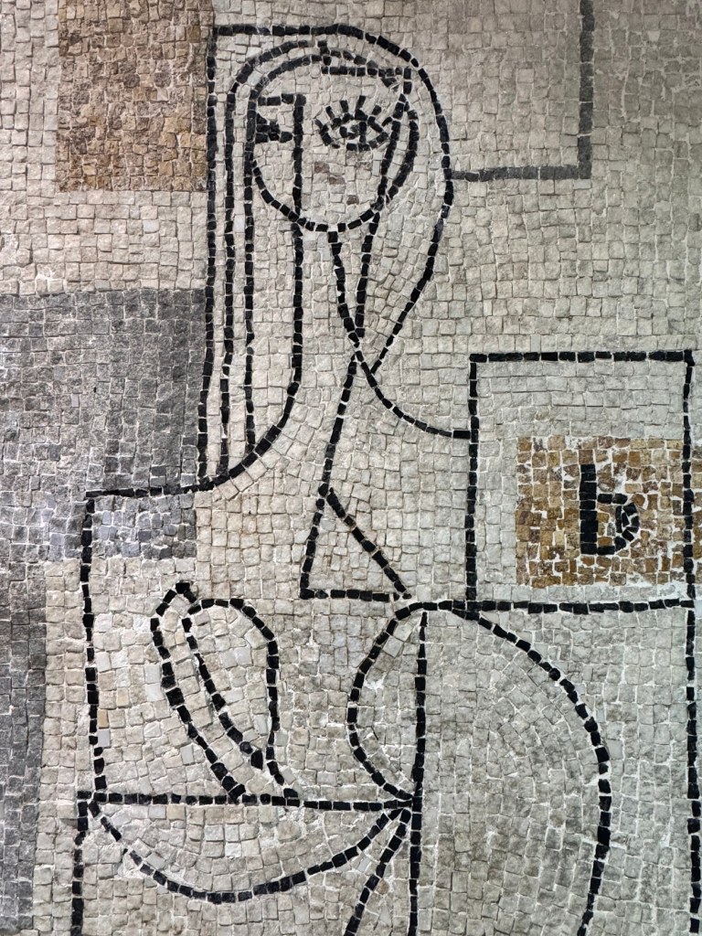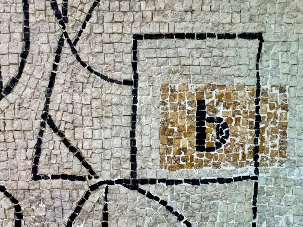 Mural mosaico con teselas de piedras de colores sobre armazón de hormigón