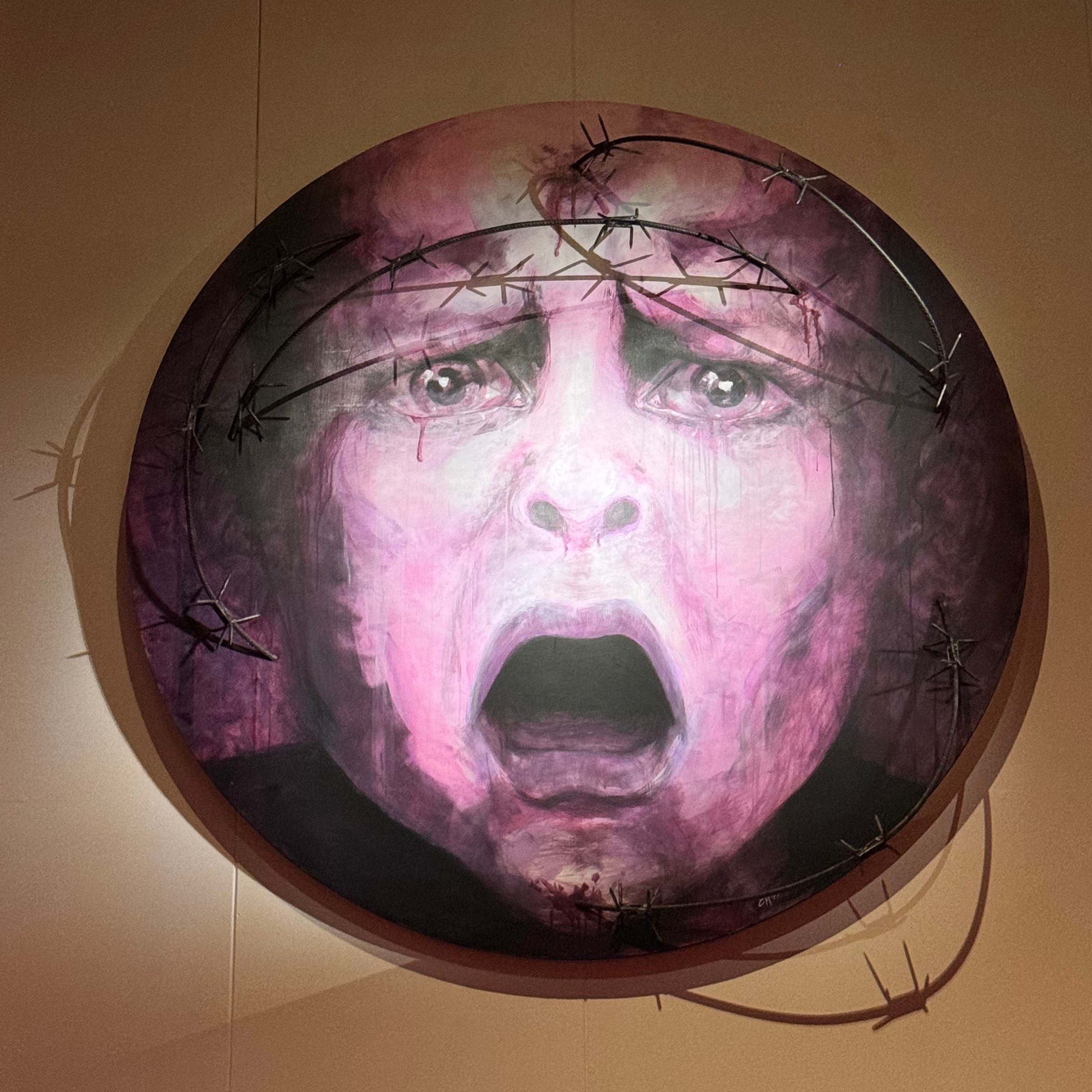 Ele Pozas, toresana, es la autora de esta impresionante obra de dos metros de diámetro que sobrecoge al espectador. La propia artista se interroga: «La inocencia robada, la ansiedad, angustia, sentirse perdido, desubicado, no entender, decepción, una pregunta sin respuesta ¿por qué?».