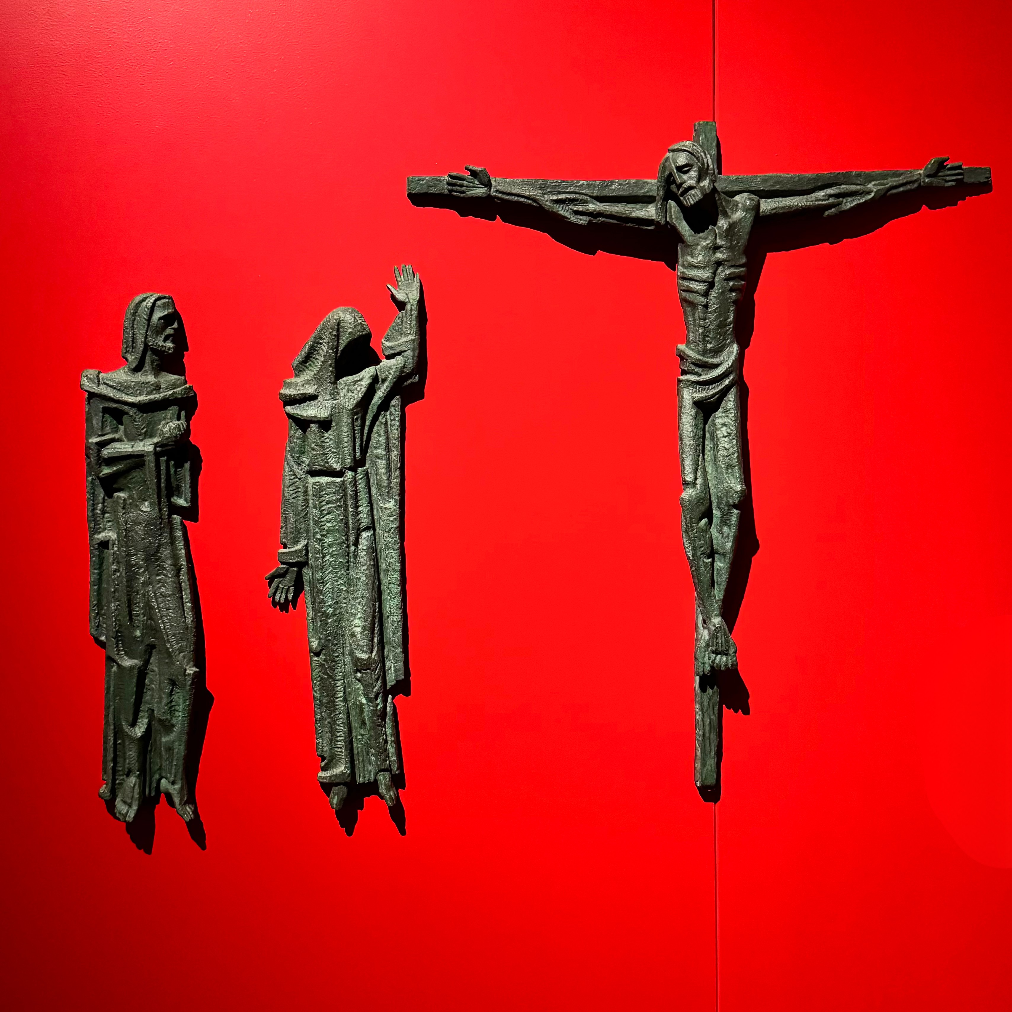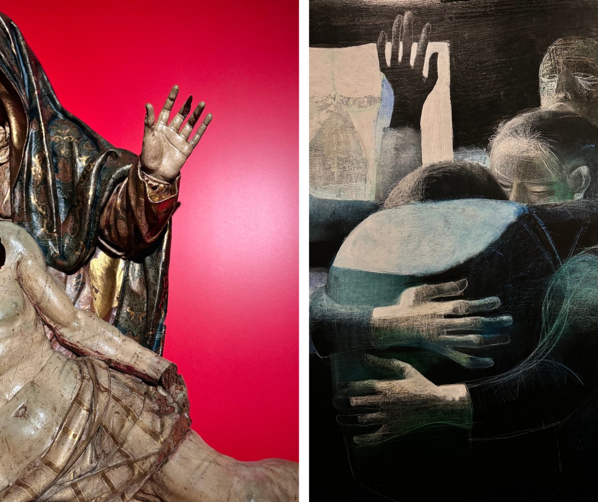 Resulta especialmente interesante el diálogo entre obras de épocas tan dispares. De las hojas de acanto de un capitel románico a la «tranquilidad estética» del «Profeta» vanguardista del escultor Pablo Gargallo (1881-1934). De las manos abiertas de la Piedad del retablo de La Anunciación de Valladolid a las manos que abrazan en el emocionante mural «Encuentro en la luz» de Teresa Peña (1935-2002). Y bajo el crucero de la Catedral, el Yacente intentando despojarse de la gravedad salido de la gubia del salmantino Venancio Blanco (1923-2018).