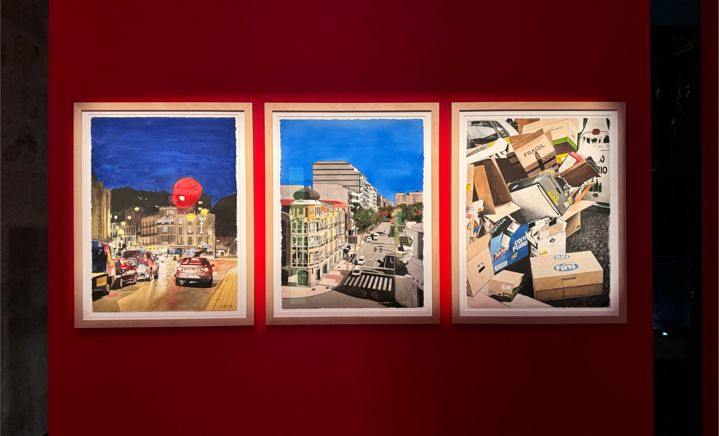 Satur Vizán domina la técnica de la acuarela. En sus obras acostumbra a retratar el paisaje urbano, calles e interiores (en este caso dos vistas diferentes de la esquina de la calle Alfonso IX con Príncipe de Asturias en Zamora). En sus escenas de desechos y embalajes dignifica lo descartado y cuestiona quizás la relación de la vida urbana con el desperdicio.
