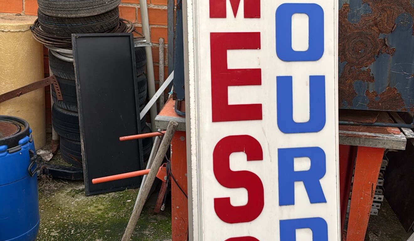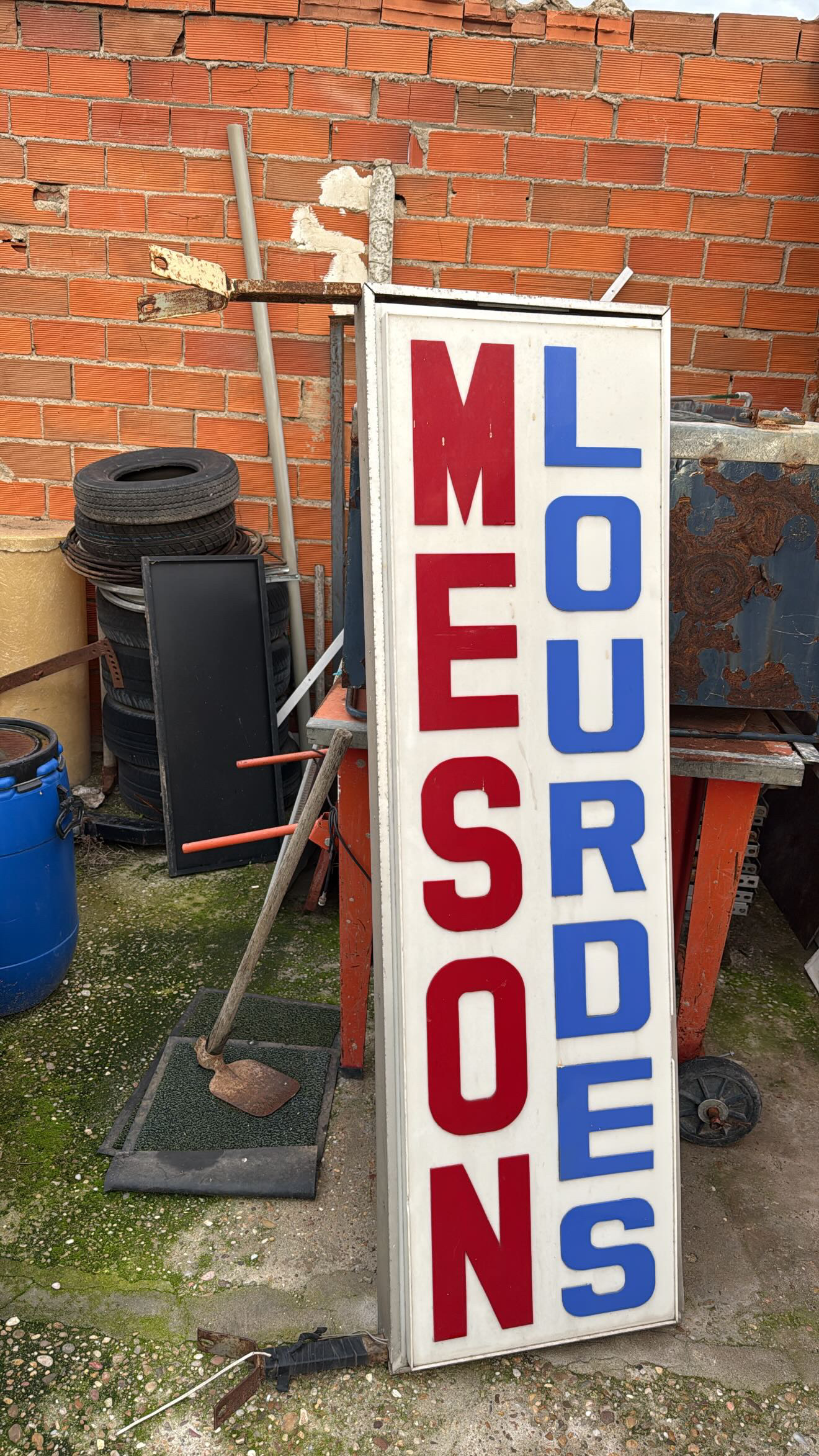 En 2022 cerraba el Mesón Lourdes, ubicado en la esquina de la calle Libertad con la calle Monsalve, junto a la Iglesia de Nuestra Señora de Lourdes, en Zamora capital. Tras el cierre, el local se puso a la venta y el rótulo fue retirado. Entre el material de deshecho que salió del local y que llegó a Desguaces Vinagre se encontraba el rótulo, por lo que Luis Miguel, responsable del desguace, decidió “indultarlo” como recuerdo de las tapas de tortilla y mollejas que había disfrutado en el mesón durante años.