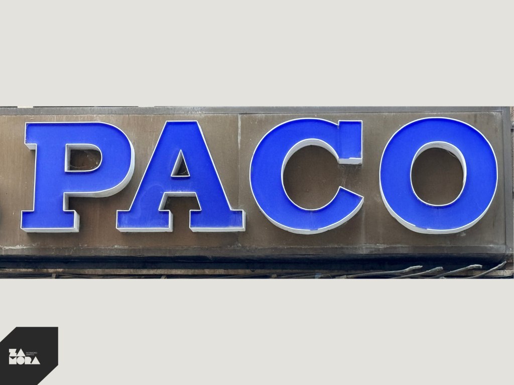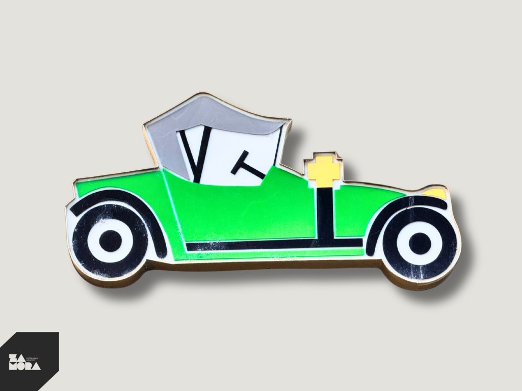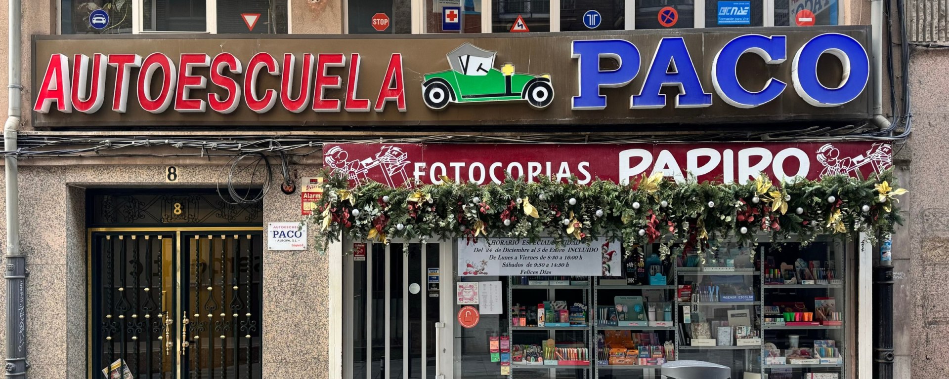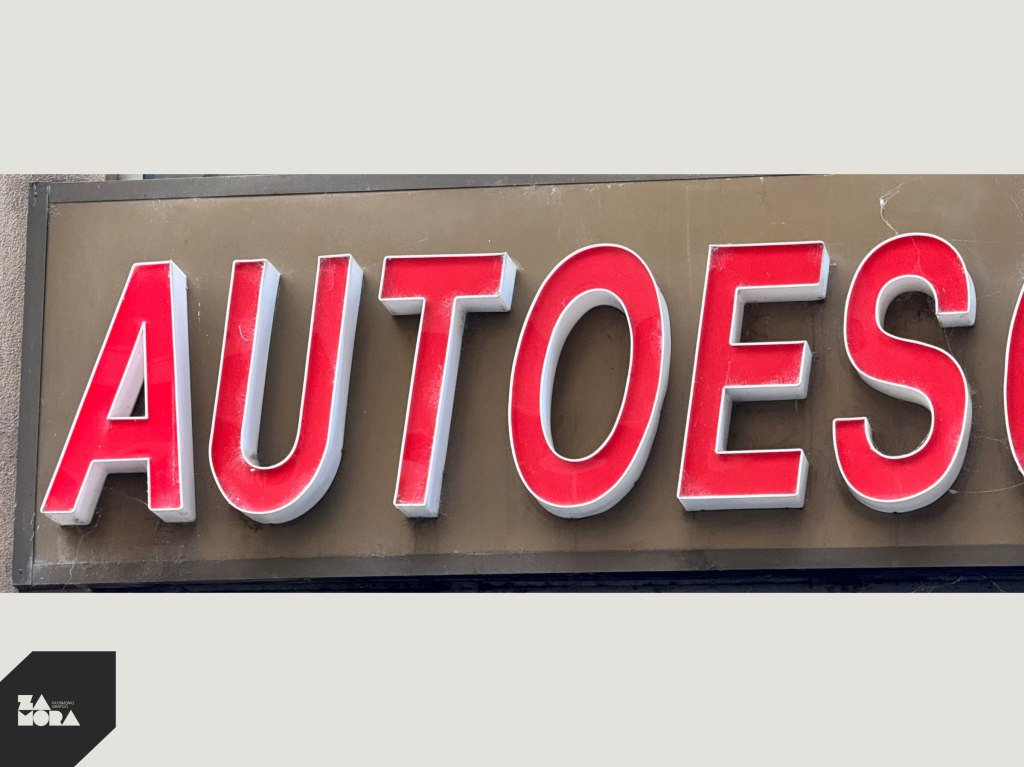 Autoescuela Paco. Rótulo en letras corpóreas y reproducción de coche clásico en plexiglás.