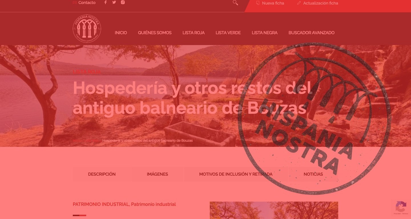 El pasado 12 de diciembre de 2025 la Asociación Hispania Nostra me comunicó que su Comité Científico, tras estudiar la propuesta que había presentado meses atrás, había considerado oportuna la inclusión de la Hospedería y otros restos del antiguo balneario de Bouzas en su Lista Roja del Patrimonio.