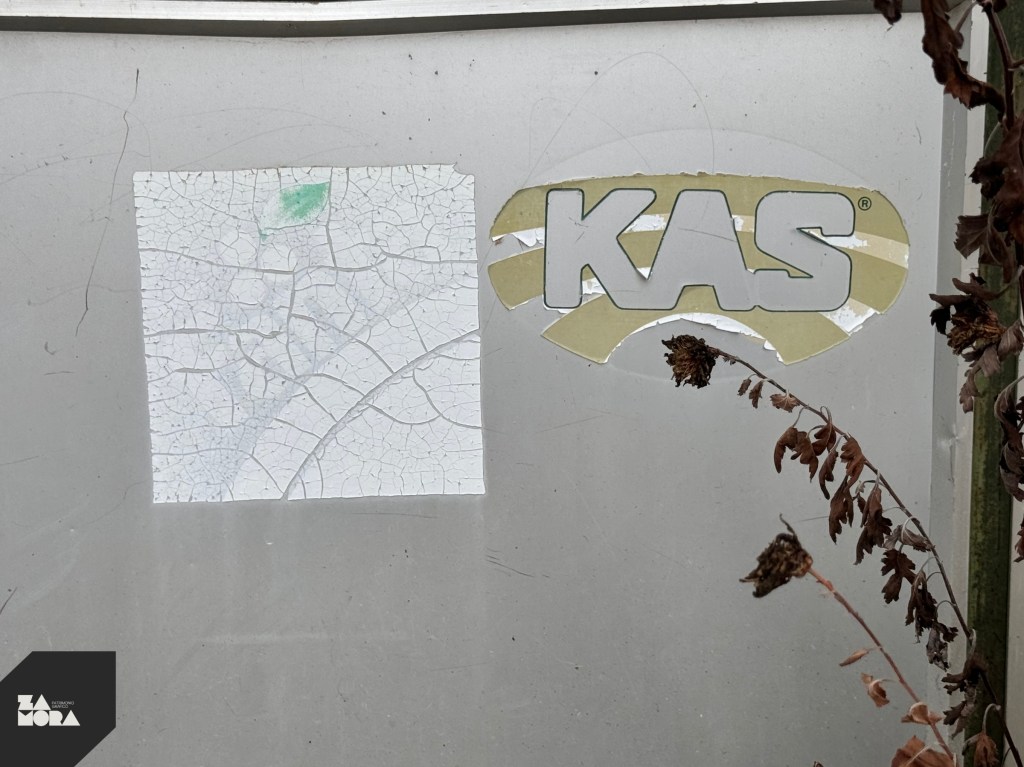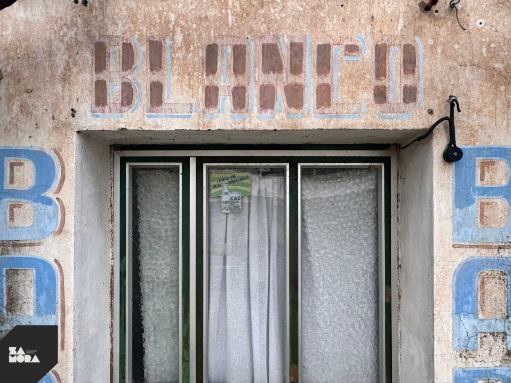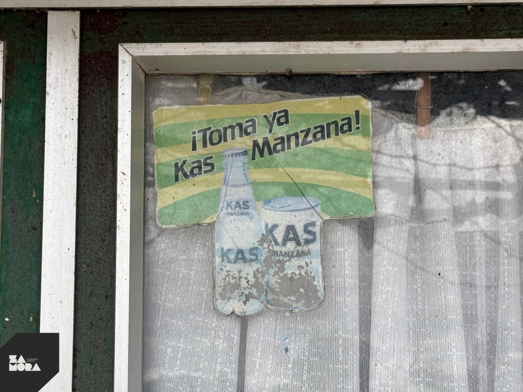 Rótulos a mano sobre la fachada y pegatinas de refrescos Kas y Fanta (años 80).