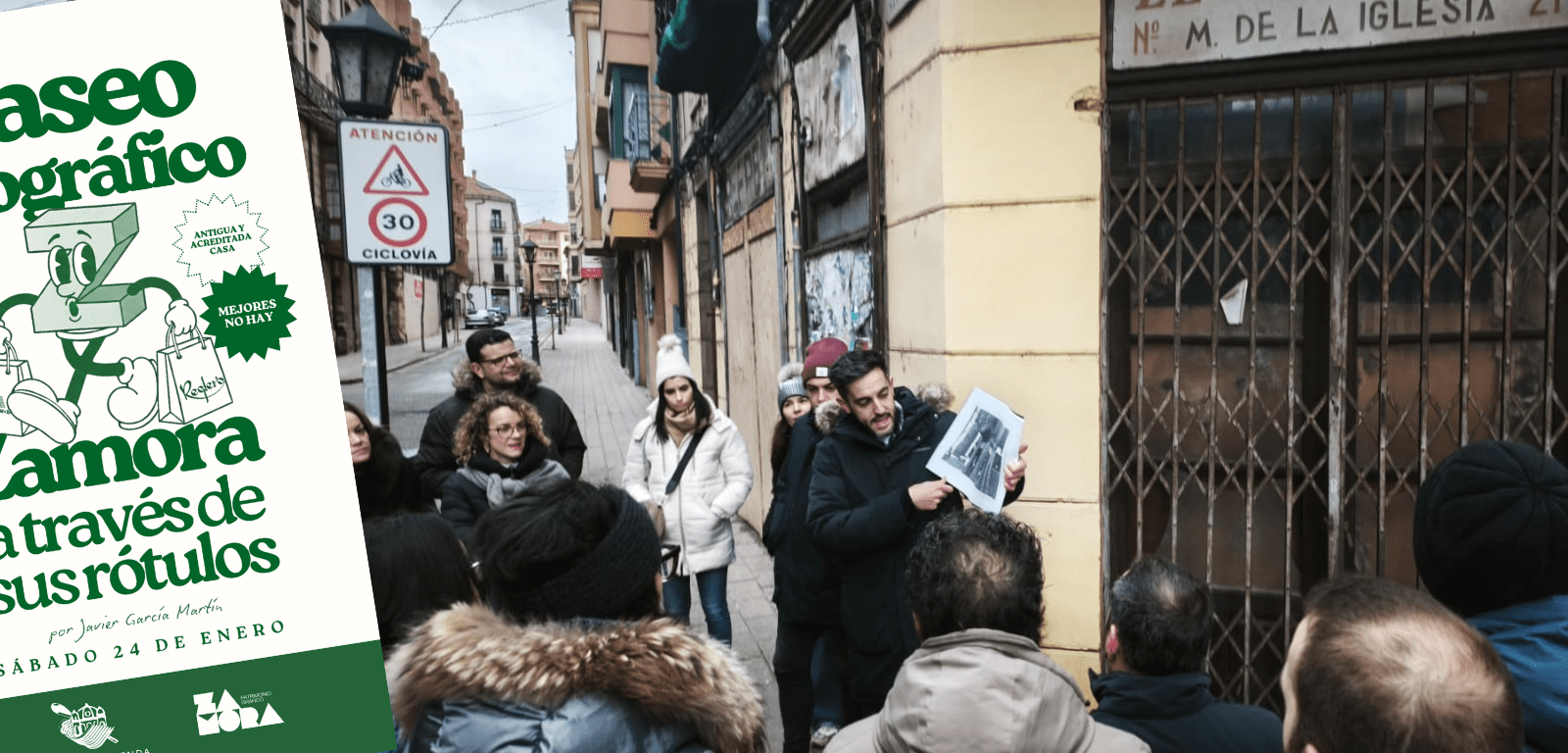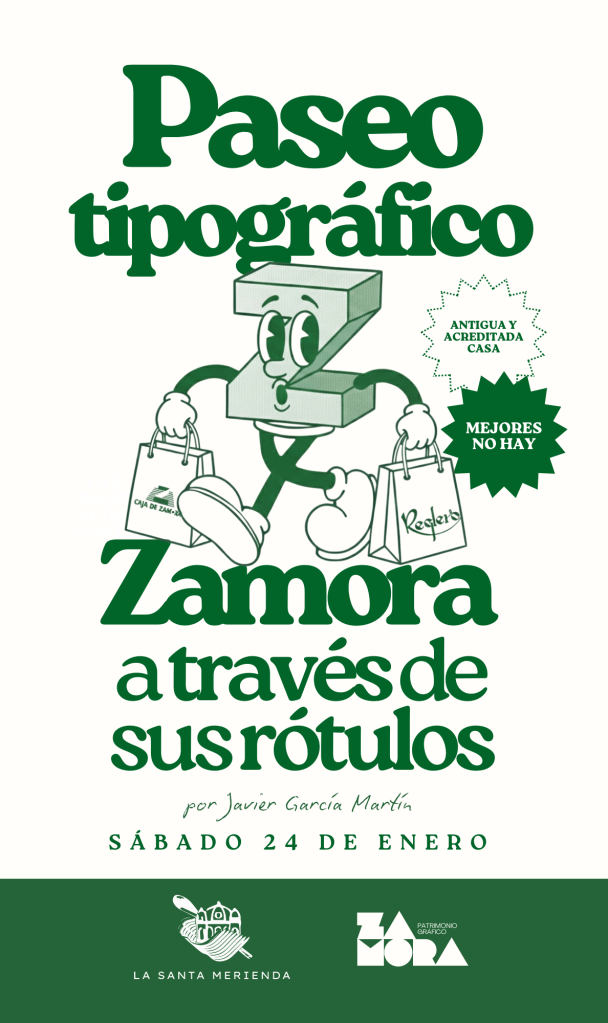 El pasado sábado, 24 de enero, a pesar del frío, se llevó a cabo la actividad organizada desde la Asociación Cultural «La Santa Merienda». Bajo el título «Paseo tipográfico: Zamora a través de sus rótulos», la ruta dio a conocer el proyecto «Zamora Patrimonio Gráfico», englobado en la Red en Defensa del Patrimonio Gráfico: