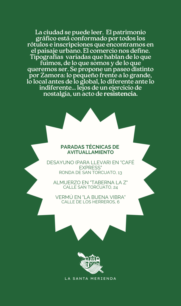 «La ciudad se puede leer. El patrimonio gráfico está conformado por todos los rótulos e inscripciones que encontramos en el paisaje urbano. El comercio nos define. Tipografías variadas que hablan de lo que fuimos, de lo que somos y de lo que queremos ser. Se propone un paseo distinto por Zamora: lo pequeño frente lo grande, lo local antes de lo global, lo diferente ante lo indiferente… lejos de un ejercicio de nostalgia, un acto de resistencia».